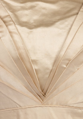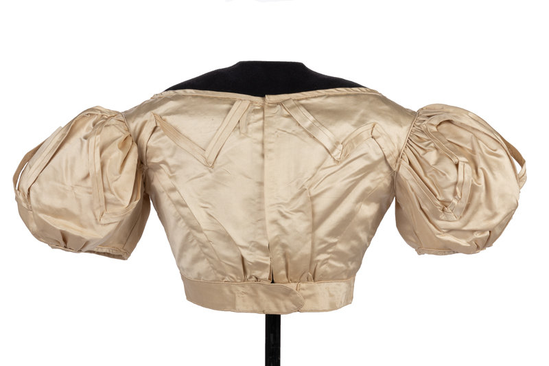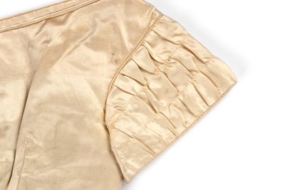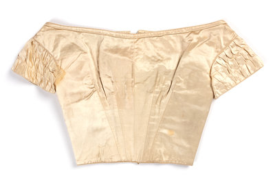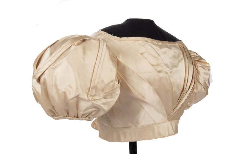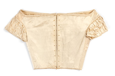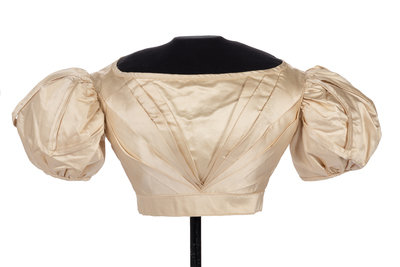 Ivory silk satin bodice with short puff sleeves trimmed with pleated satin, V-shaped front detail, and back hook and eye closures.