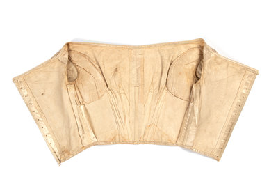 Ivory silk satin bodice with wide neckline, gathered short sleeves, and back lace up closure (no lacing included). The interior has two pads on each side of the bustline.