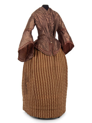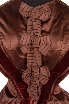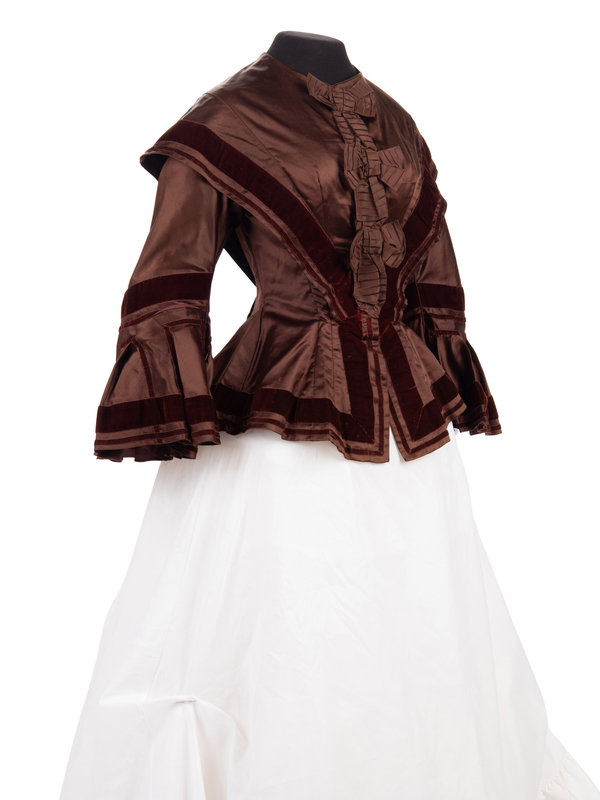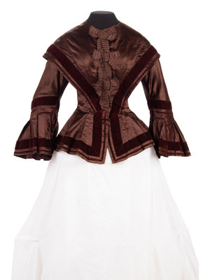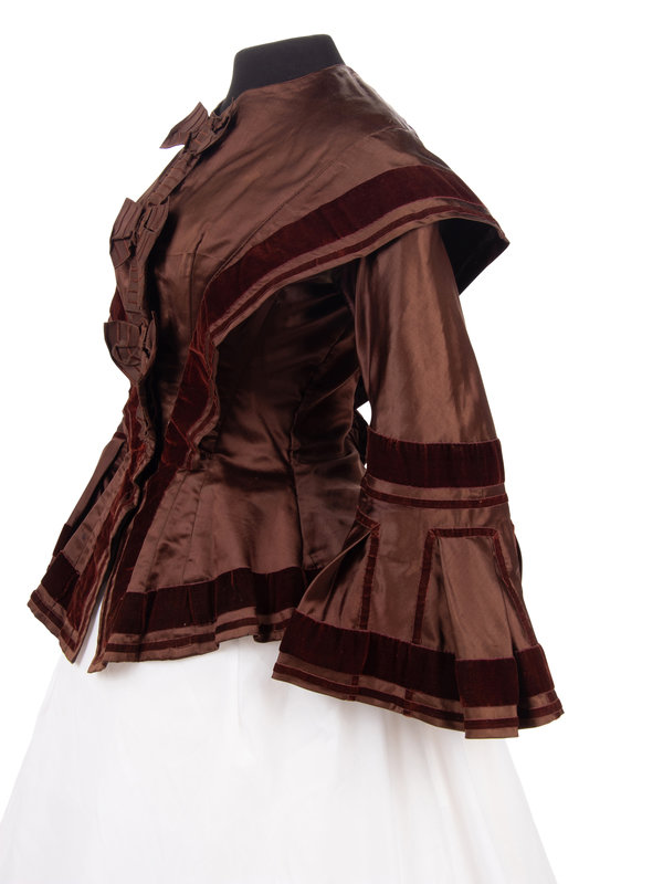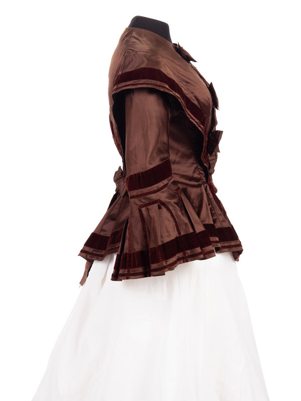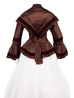 Brown silk satin bodice trimmed with brown silk velvet, flared sleeves and peplum and center front hook and eye closures.