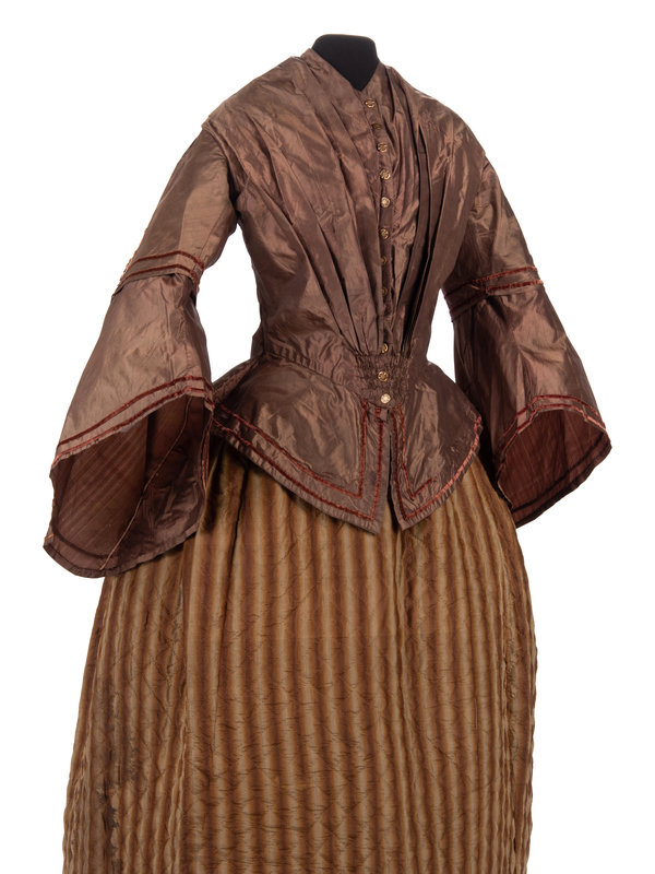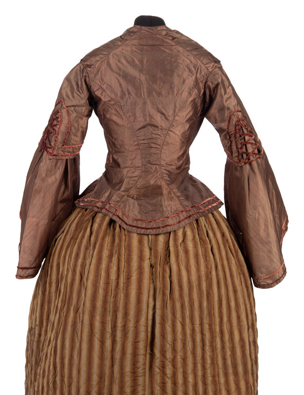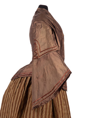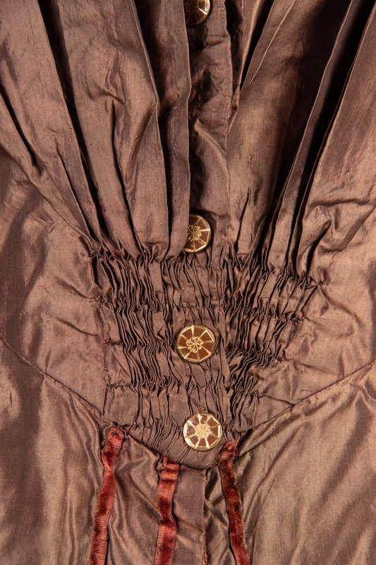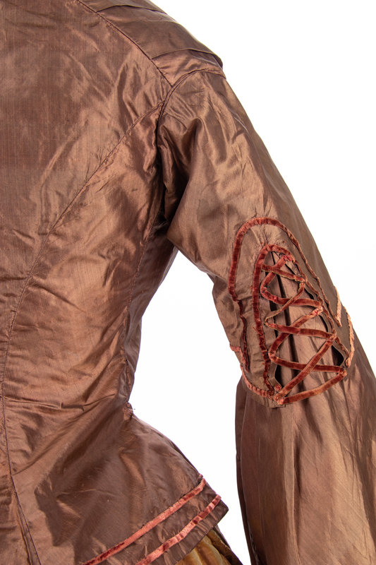 Light brown iridescent silk taffeta bodice trimmed with thin bands of velvet on tiered flared sleeves and peplum, gold-tone buttons, and front hook and eye closures.