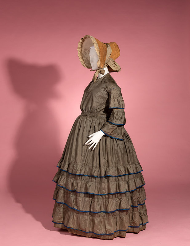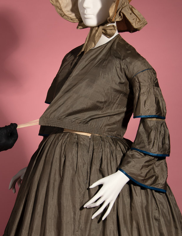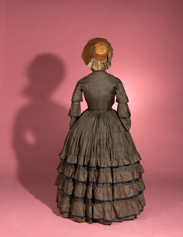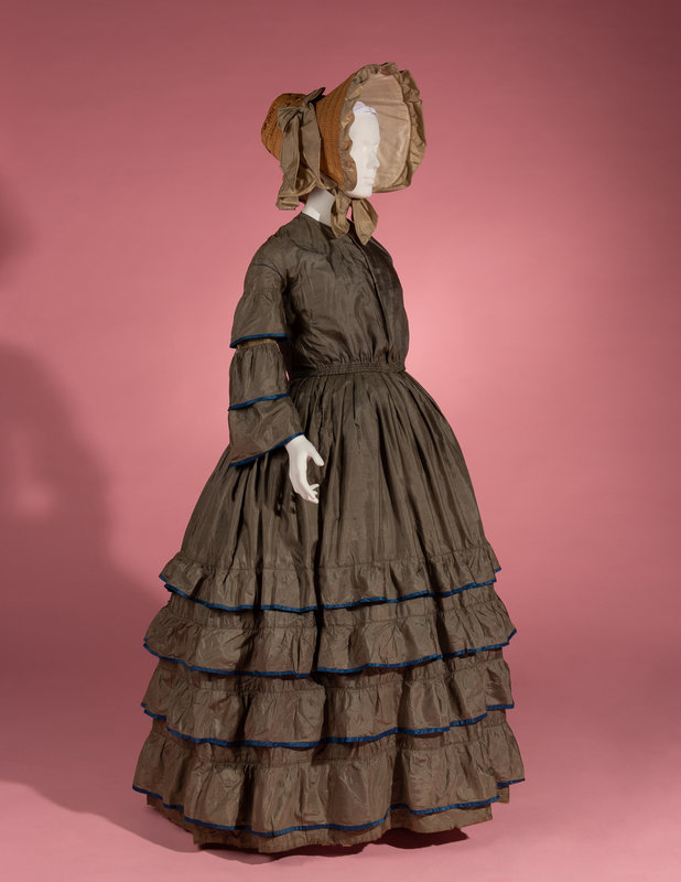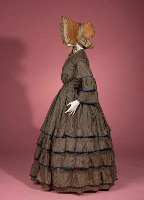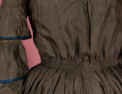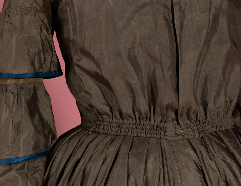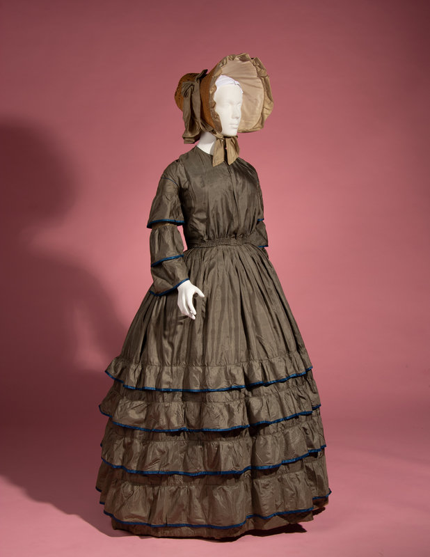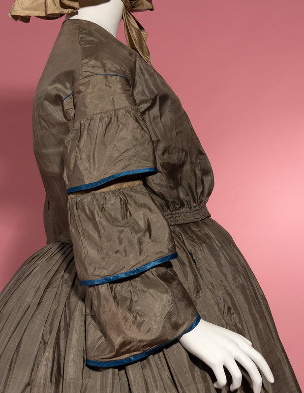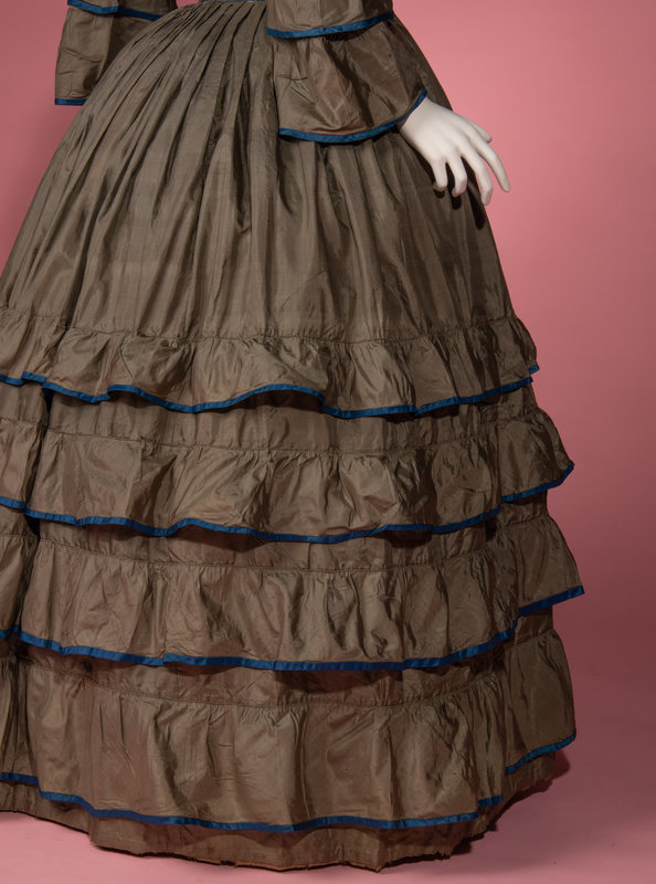 Dull green silk day dress trimmed with blue silk taffeta on tiered sleeves and skirt, front bodice opening with adjustable front waistline, and full skirt.