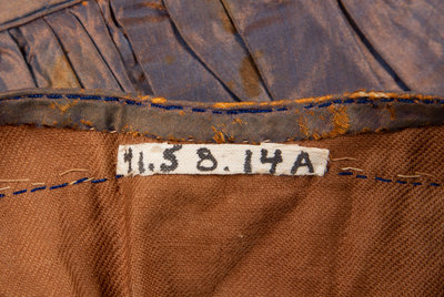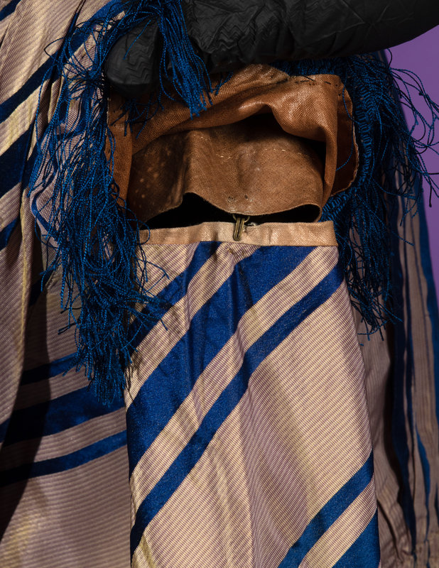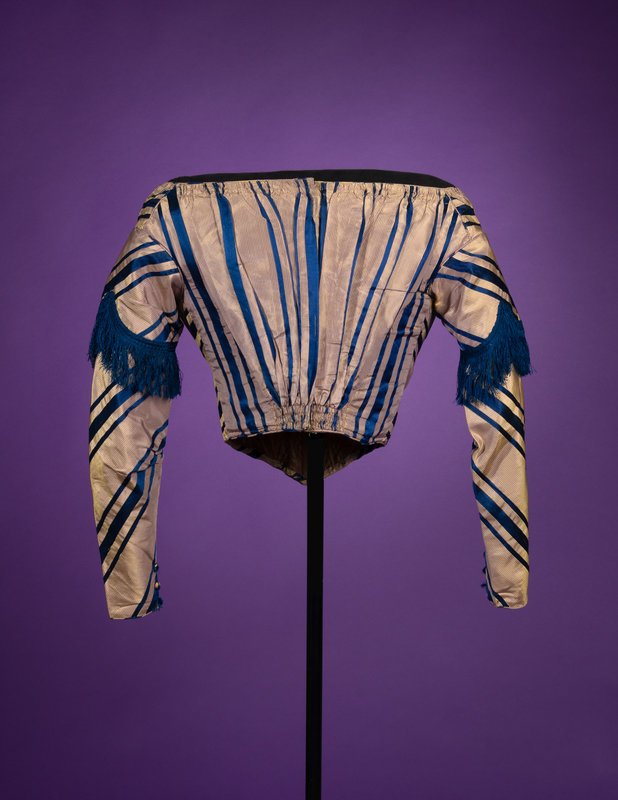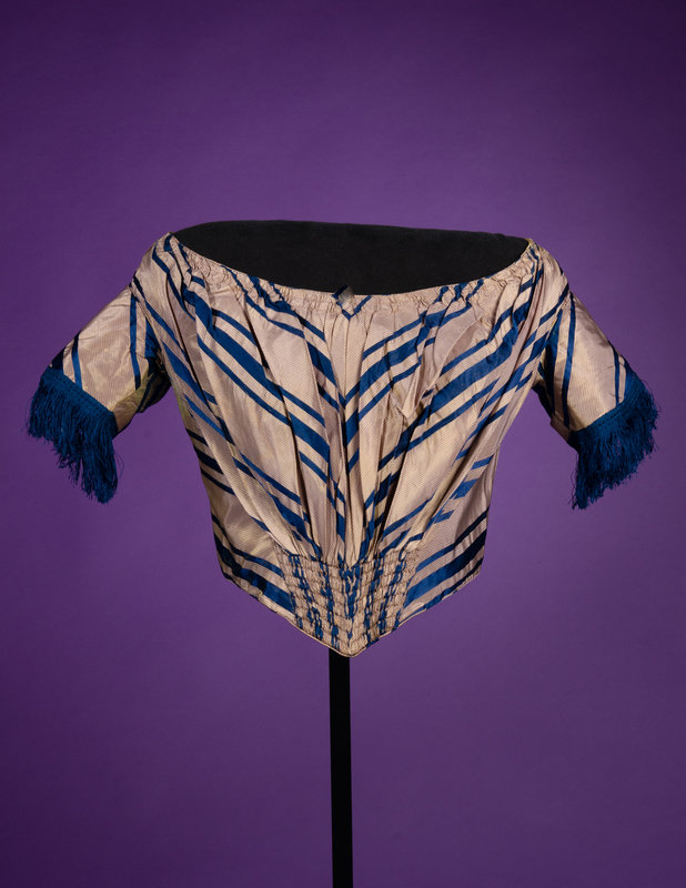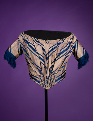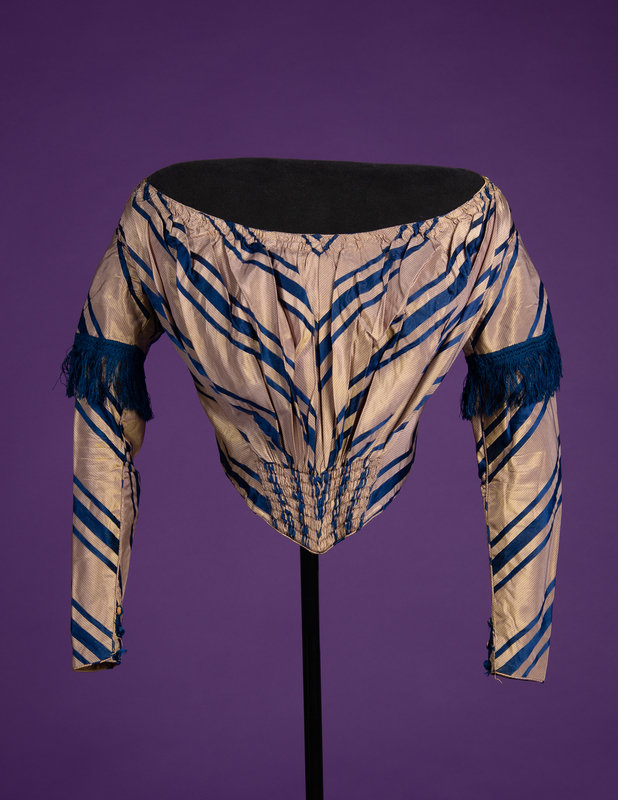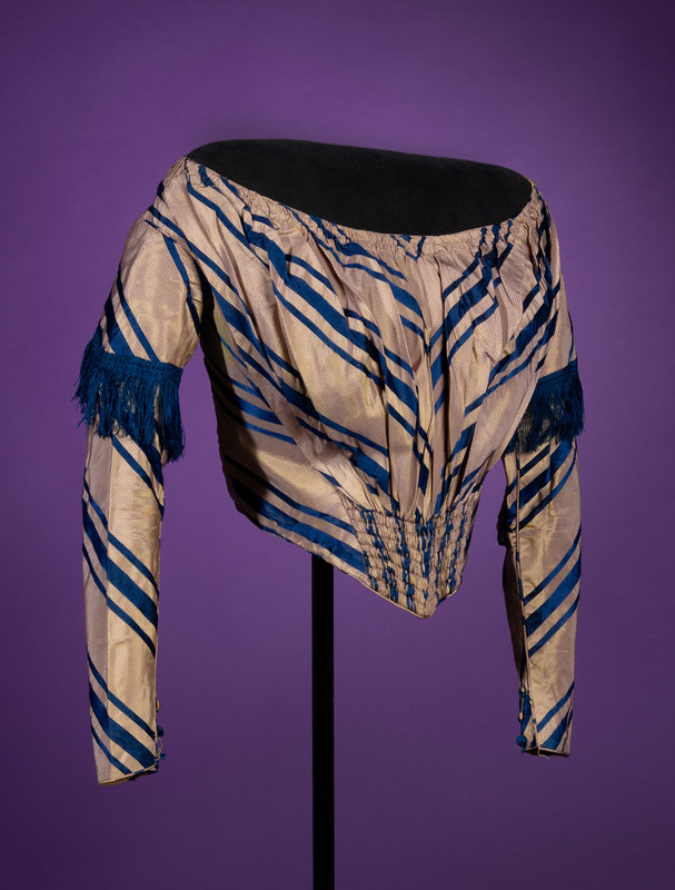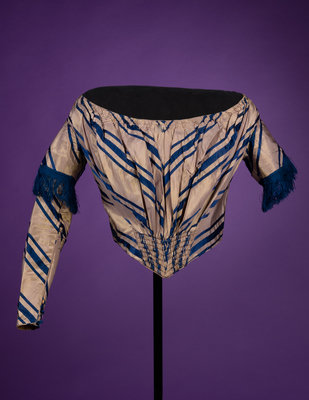 Striped blue and mauve silk taffeta bodice trimmed in blue fringe with gathered and smocked front, fitted separating sleeves, and center back hook and eye closures. The sleeves separate under the blue fringe with a series of hooks and eyes.