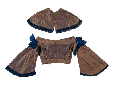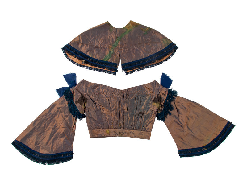 Bronze iridescent silk taffeta bodice with gathered front and back, flared sleeves, and trimmed in blue fringe; paired with matching capelet with armholes.