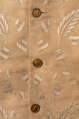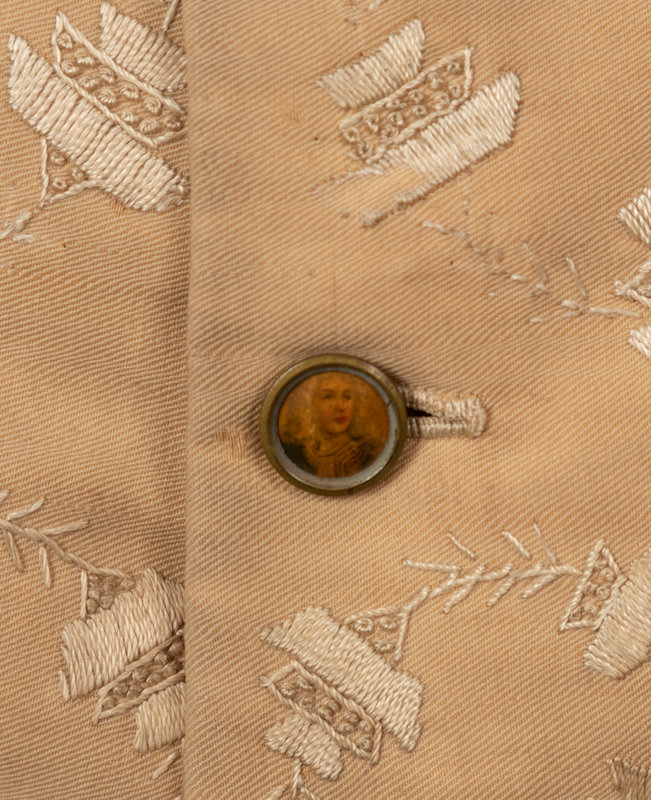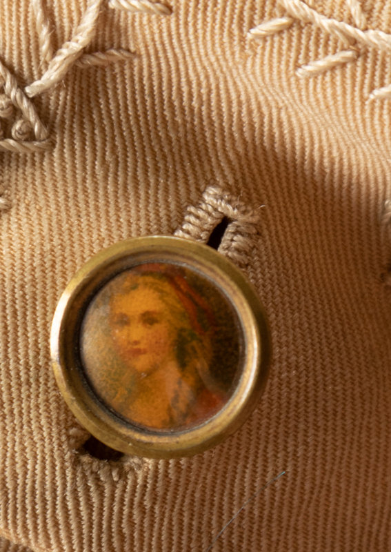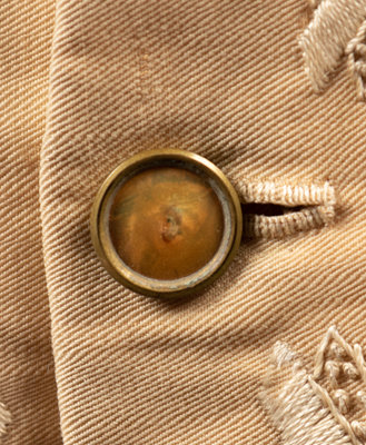 Ecru silk twill with cream floral embroidery, stand collar, and brass buttons with hand-painted faces on each.