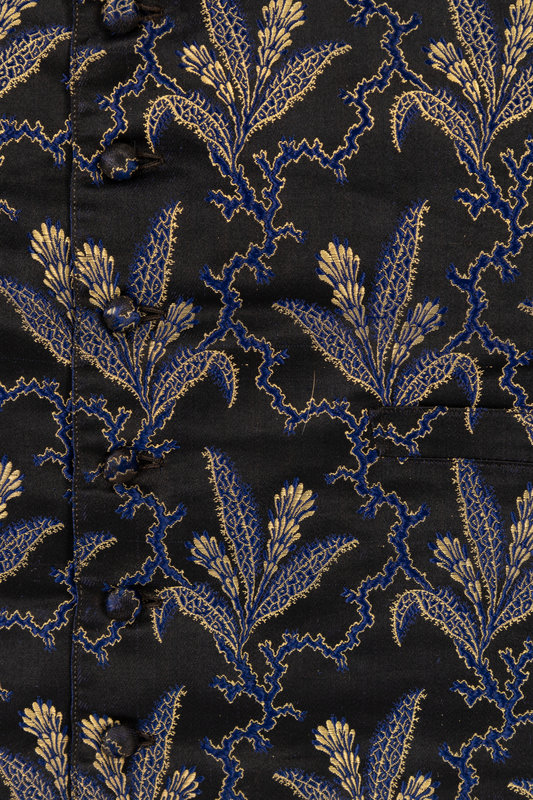 Navy blue silk satin brocade in cobalt blue and yellow floral motif, shawl collar, and front button closures.