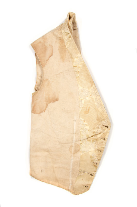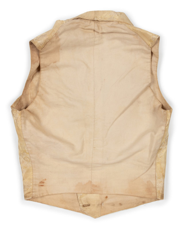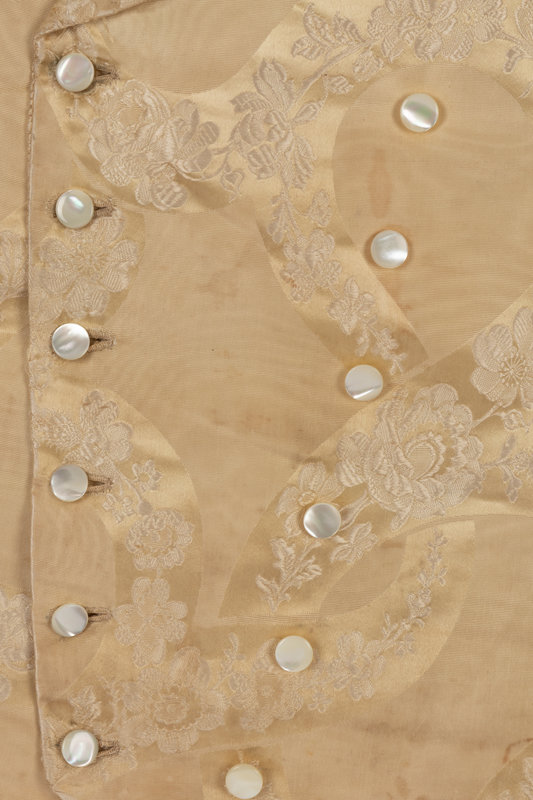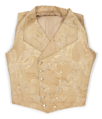Ivory and white silk moiré brocade with floral pattern double breast vest, padded front, rolled lapel, and front button closures.