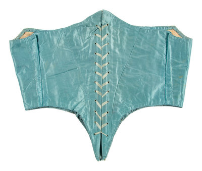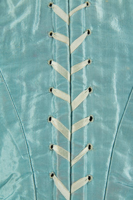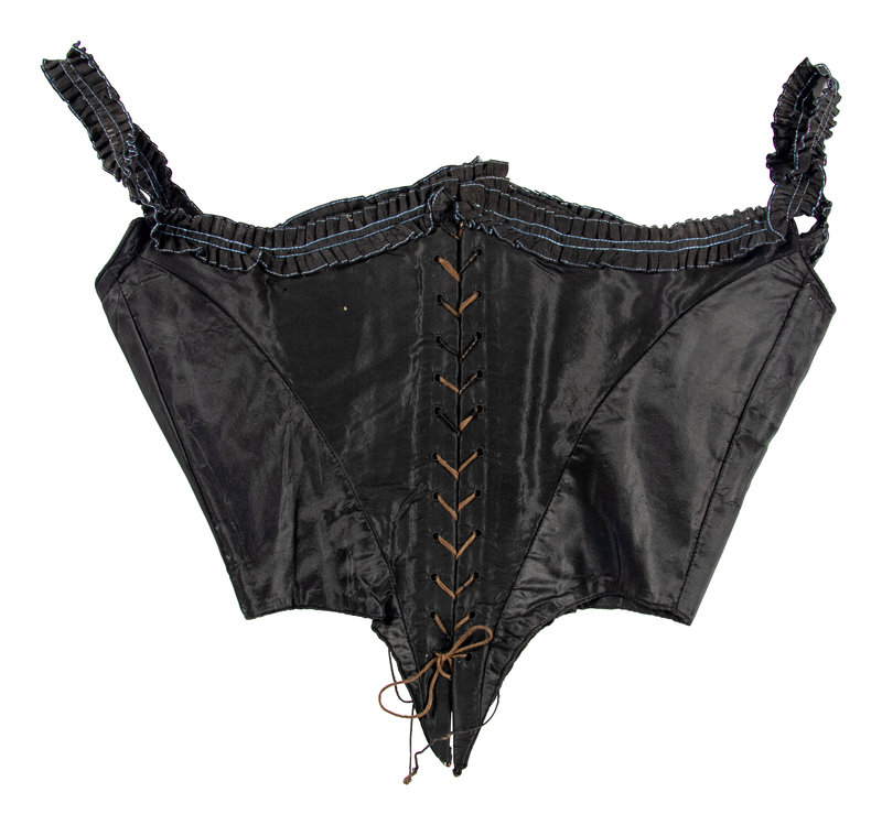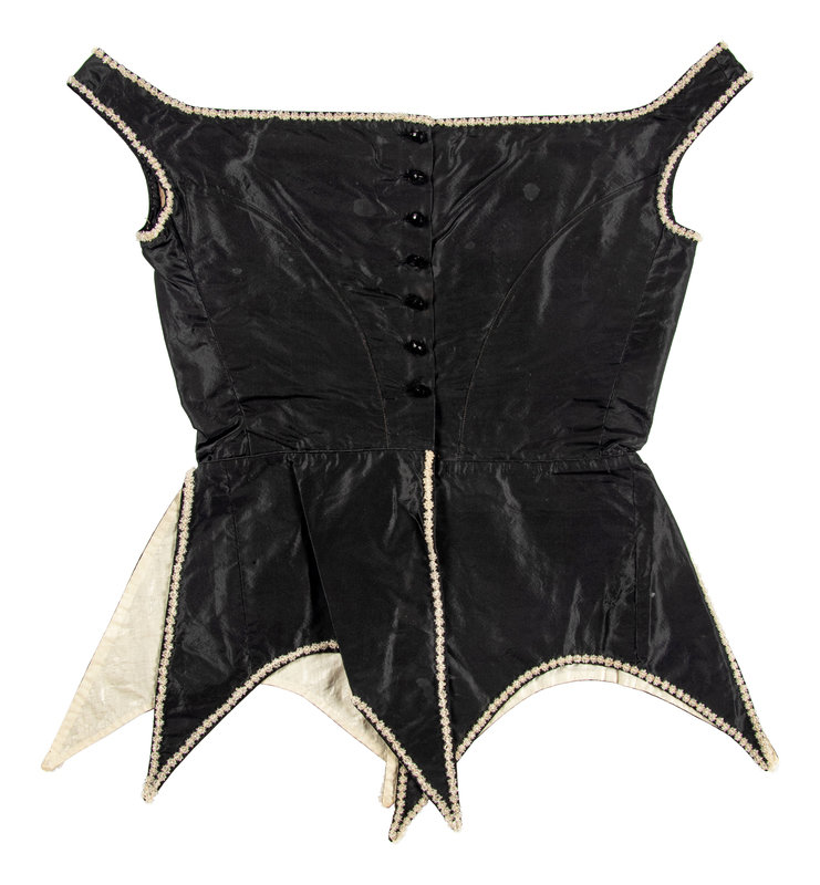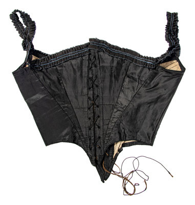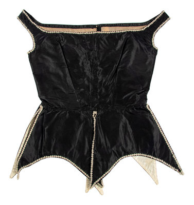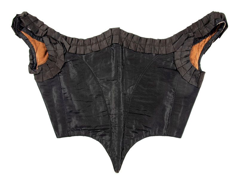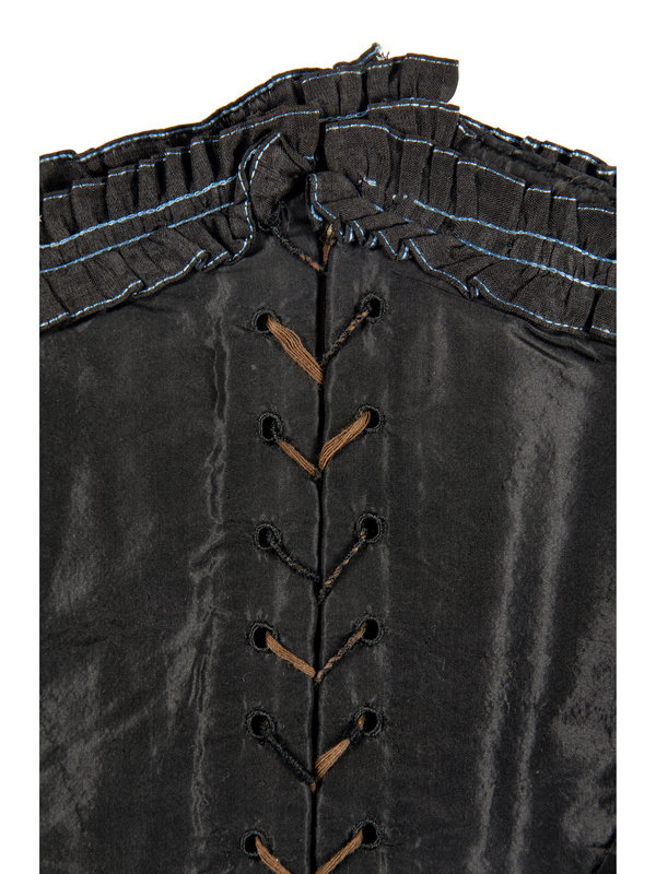 Black silk taffeta corselet with ties down front and back, and trimmed with pleated black cotton and blue topstitched trim.