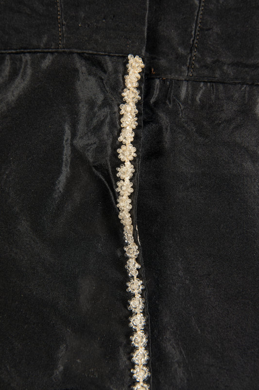 Black silk taffeta sleeveless bodice embellished with clear glass beads, paneled peplum, and center back black glass button closures.