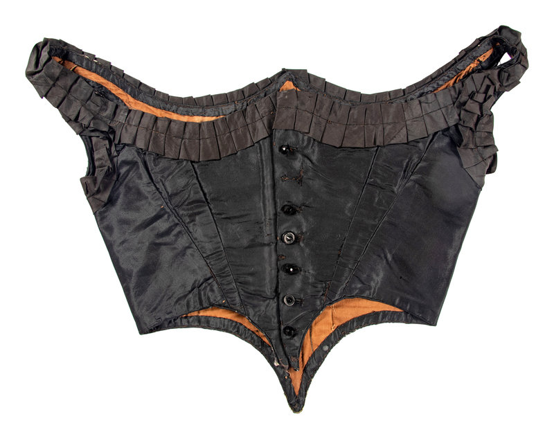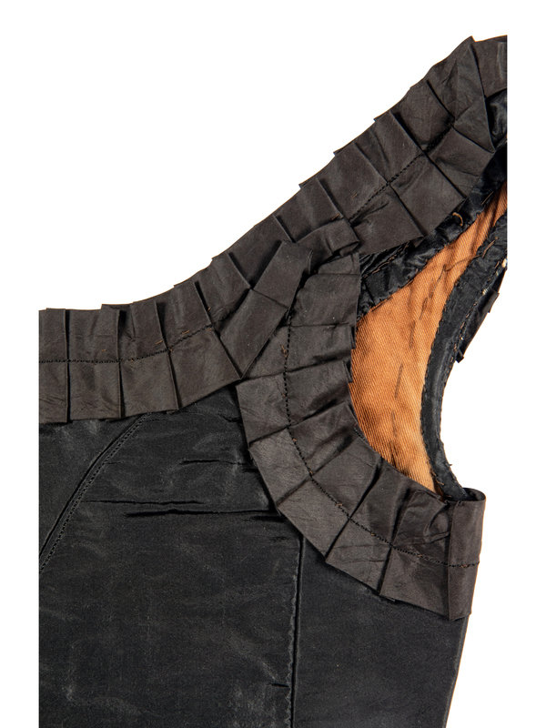 Black silk taffeta sleeveless bodice with pleated taffeta detail along the neckline and armholes, and center front black button closures.