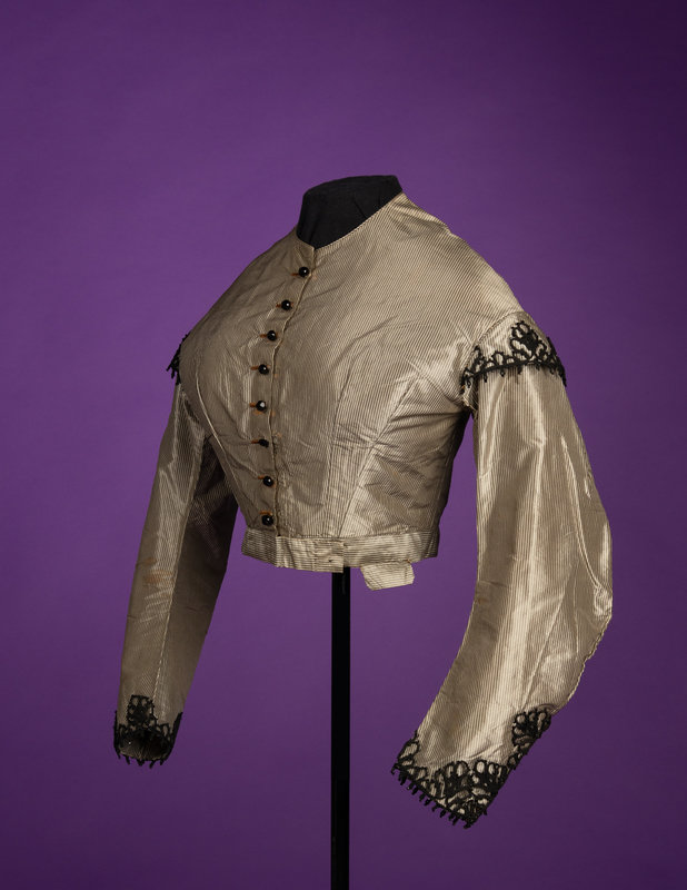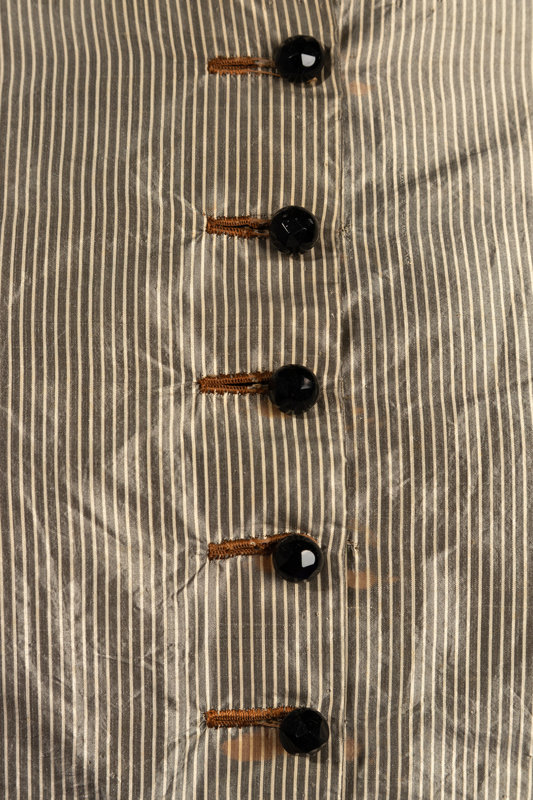 Grey and black striped silk drop shoulder bodice trimmed in black beading and braid, and center front button closure.