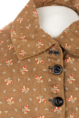 Brown printed cotton/wool jacket with rolled collar, straight fit sleeves, and center front button closures.