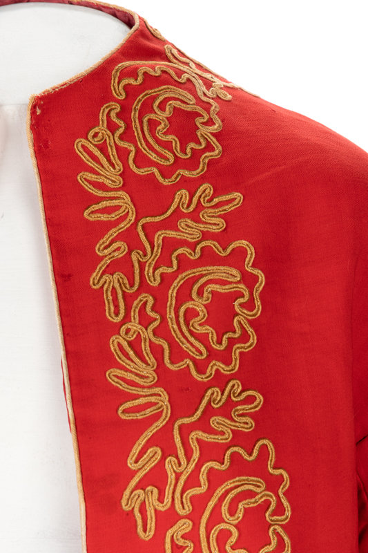 Red wool Zouave style jacket trimmed in golden yellow braid trim on neckline and sleeve hems, and top front hook and eye closure.