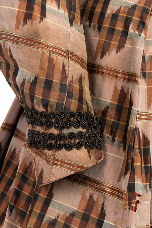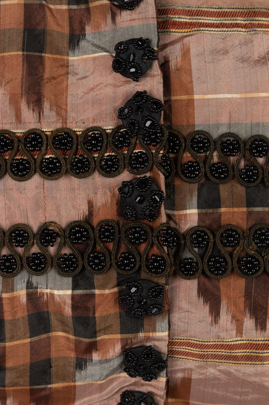 Brown and black silk taffeta evening dress with woven stripe and Ikat print, trimmed with black braiding and beading along the chest and sleeves, sleeves with puffed caps, full gathered skirt, and front hook and eye closures with button details.