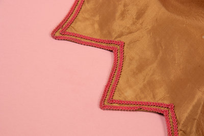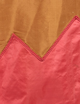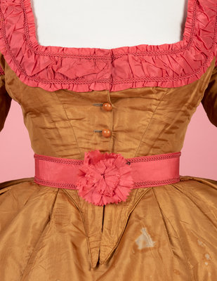 Tan silk taffeta evening dress with bright pink taffeta accents, box neckline, front pointed waist, and full circular skirt with detachable pink taffeta belt.