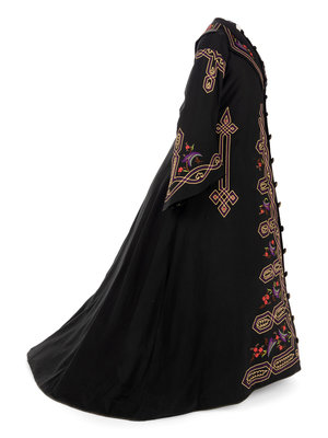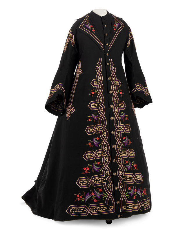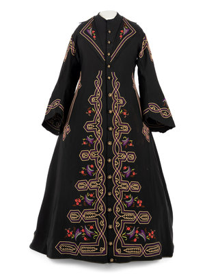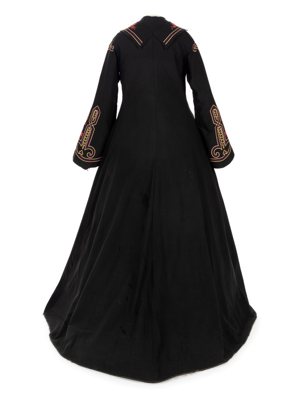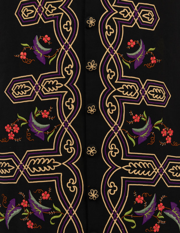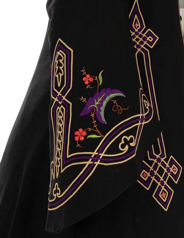 Black wool with red and purple floral embroidery and trimmed in light yellow and purple braid, attached notched lapel to clean neckline, flared uneven hemmed sleeves, full skirt, and center front button closures.