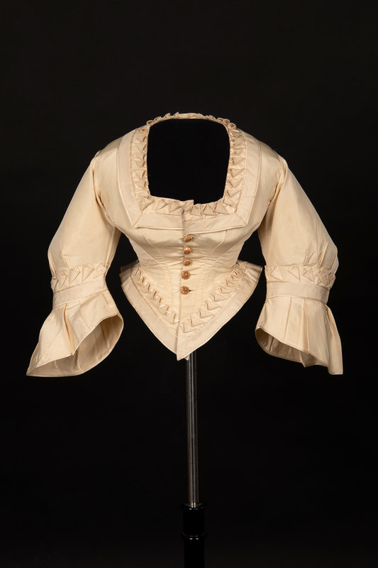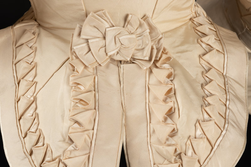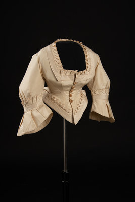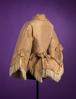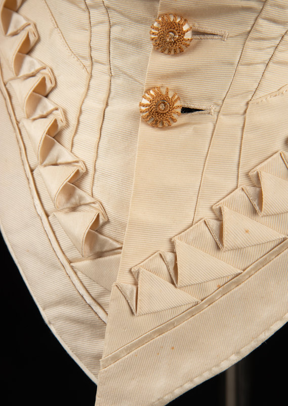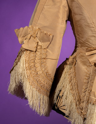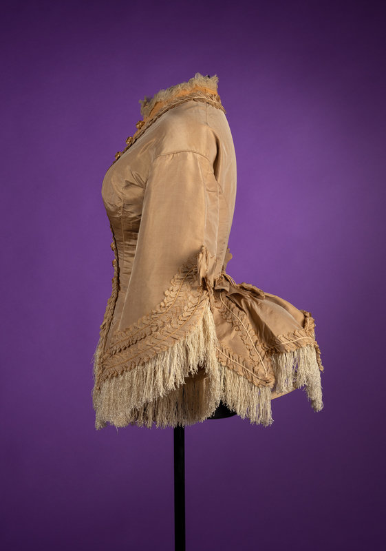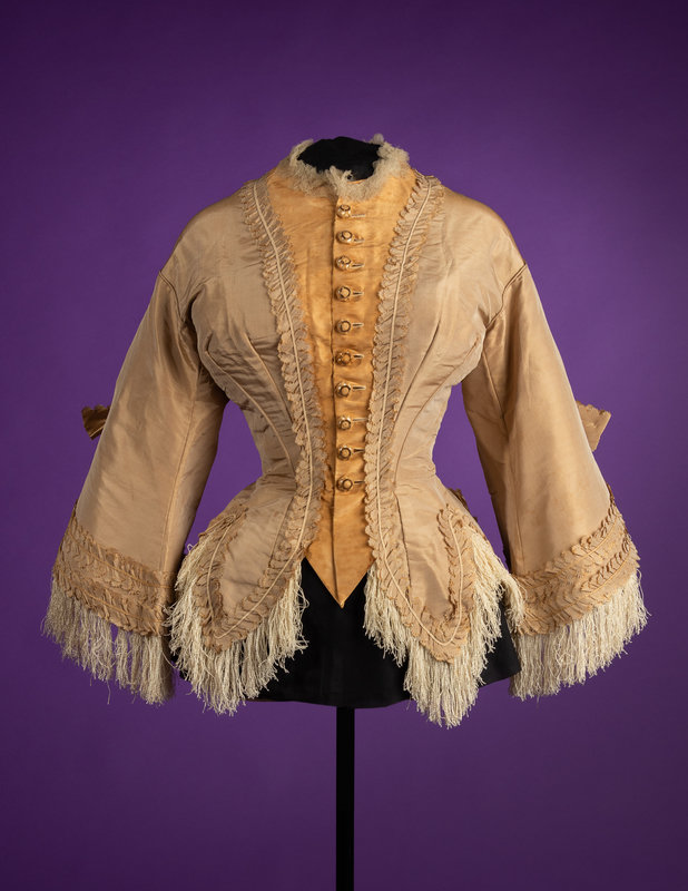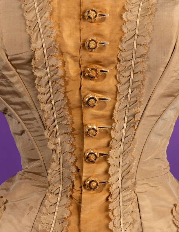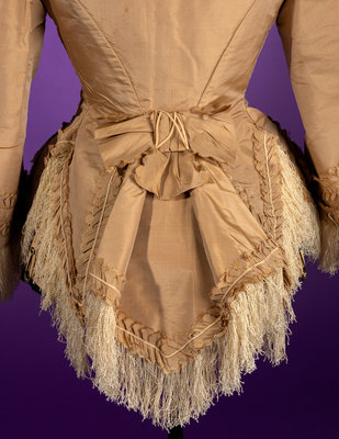 Taupe silk taffeta bodice trimmed with ruched and applied trim, silk net along neckline and fringe, front wheat silk taffeta insert with crocheted covered buttons, bell sleeves, and paneled peplum.
