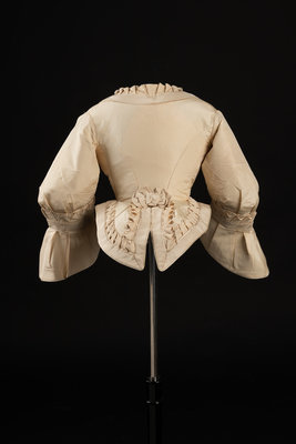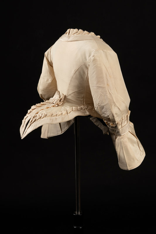 Cream silk taffeta bodice with box cut neckline, full sleeves gathered into flounces, and short peplum trimmed in stylized pleating.