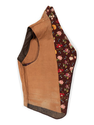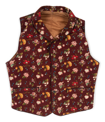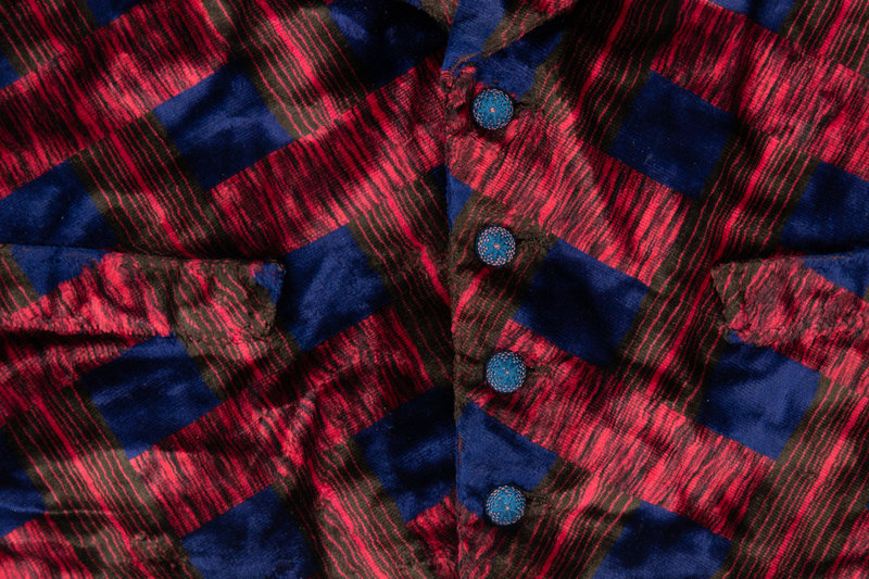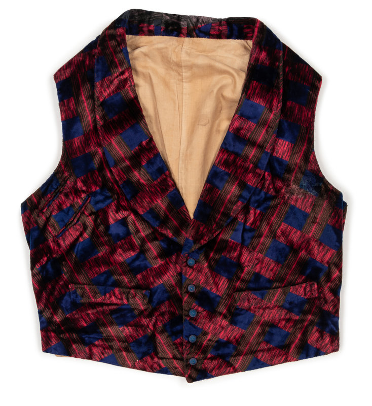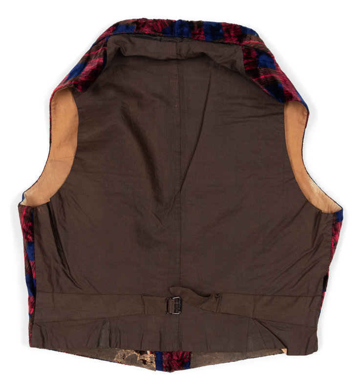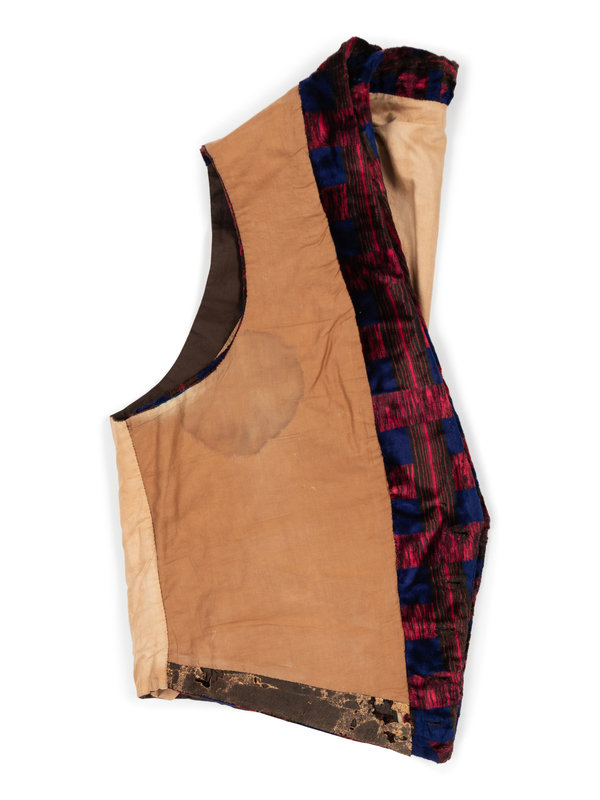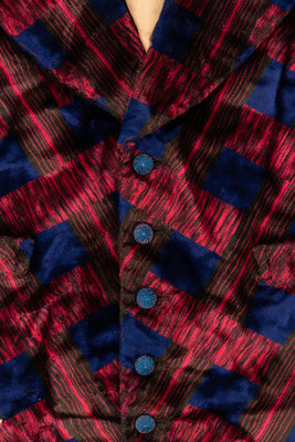 Red, brown, and blue silk velvet vest with chest and waist pockets, and silk thread covered button closures.