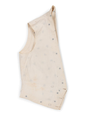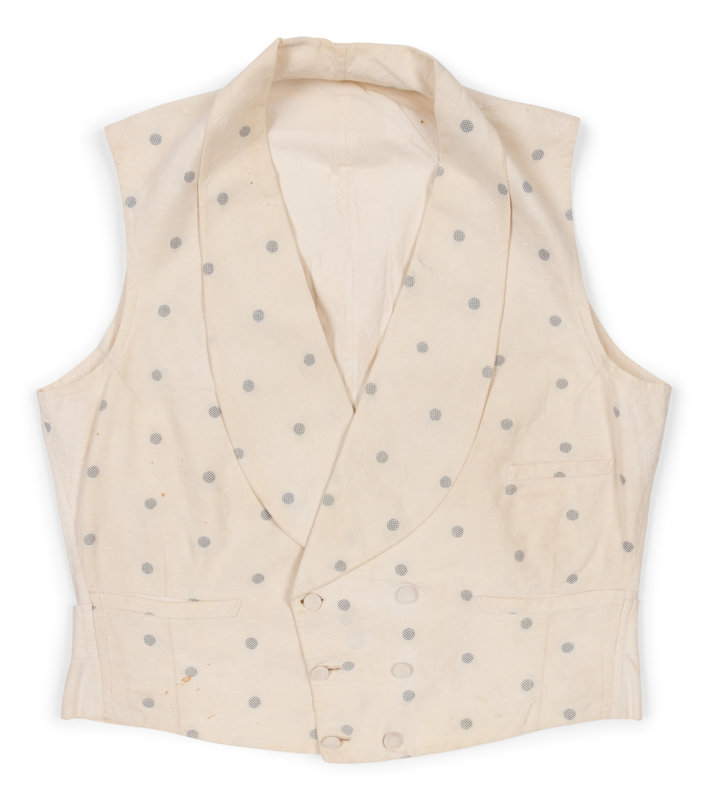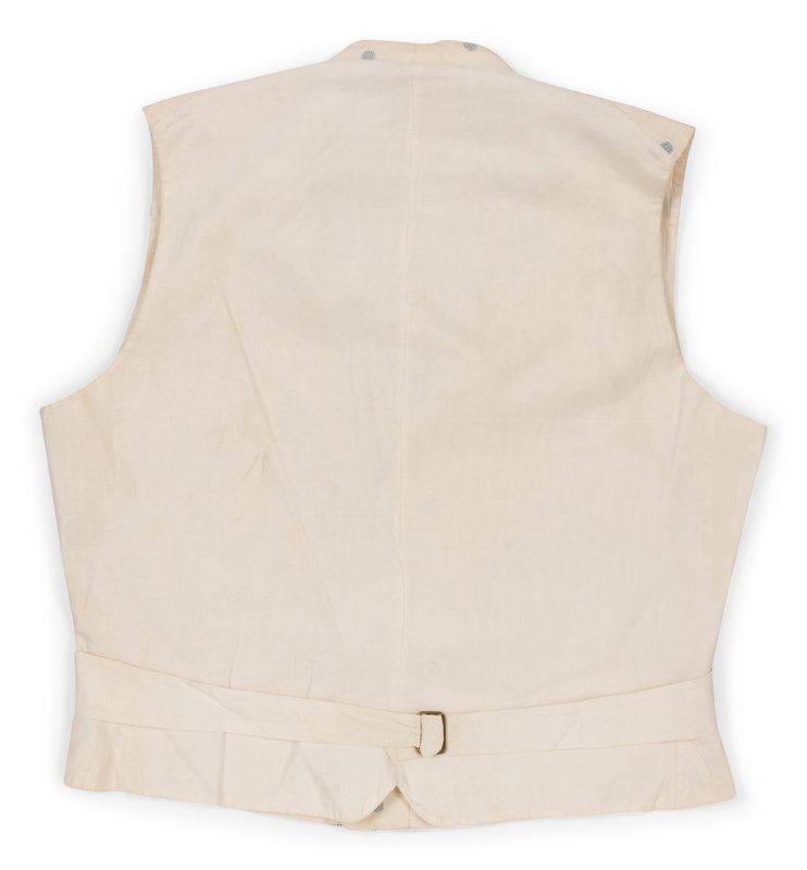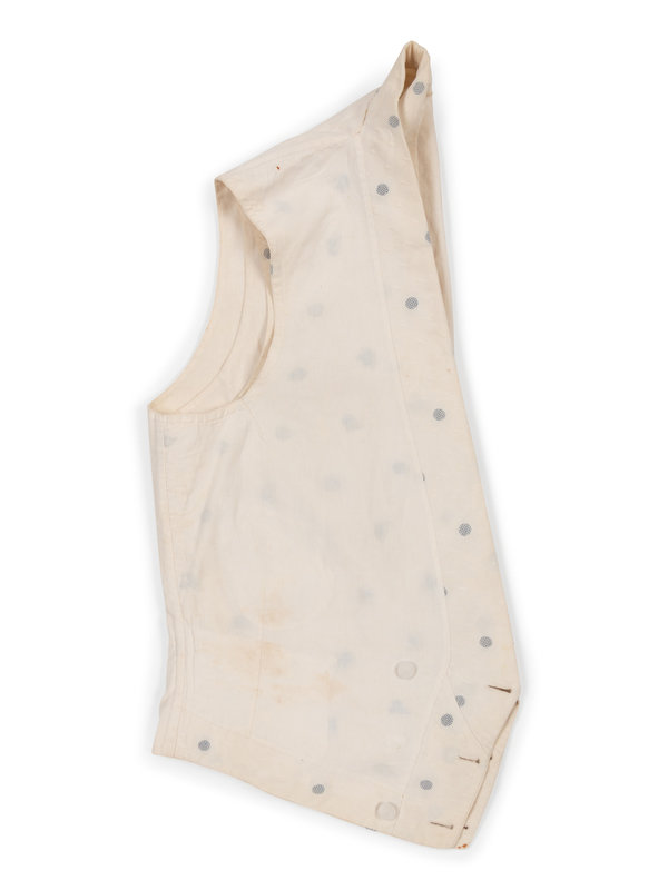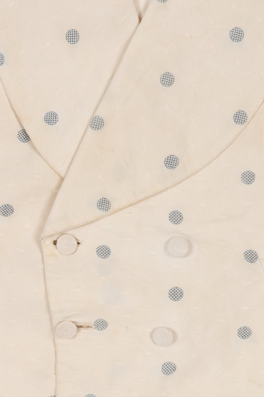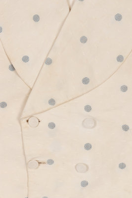 White cotton jacquard brocade double breast vest with raised diamond and blue circle pattern.