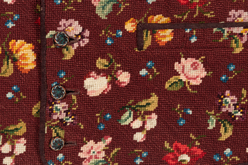 Burgundy needlepoint with multi-hued floral motif, waist pockets and front button closures.