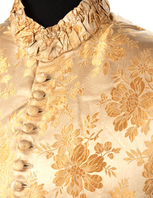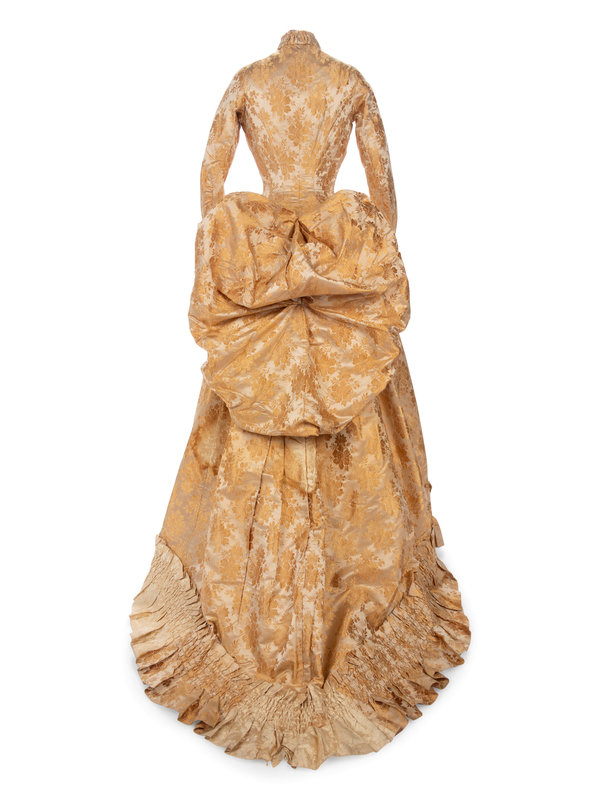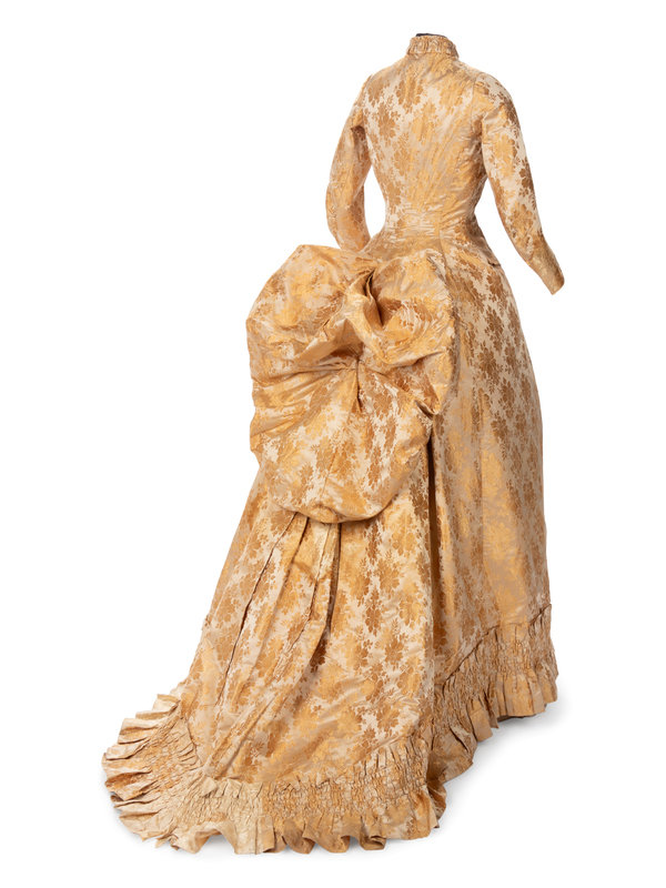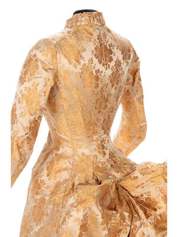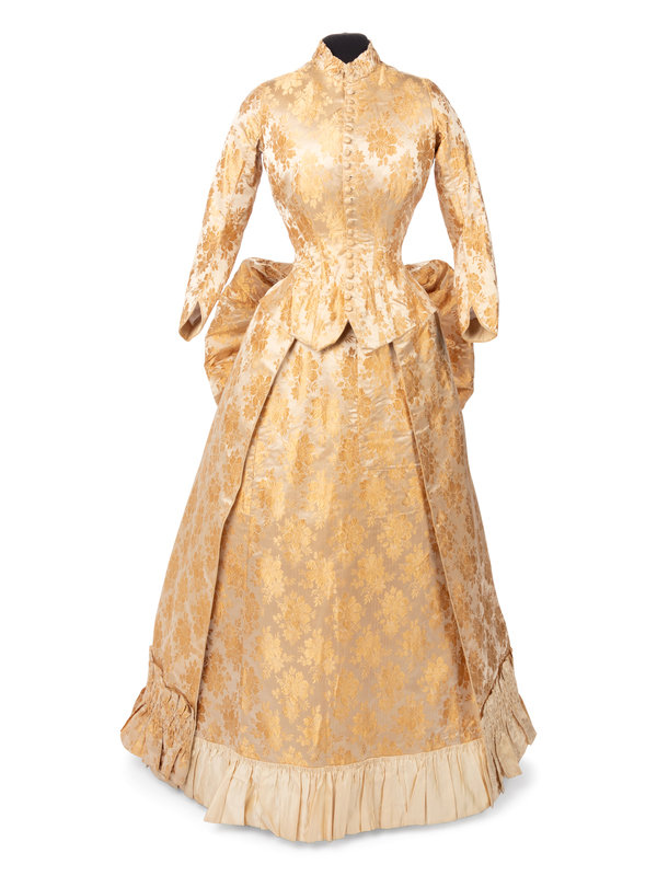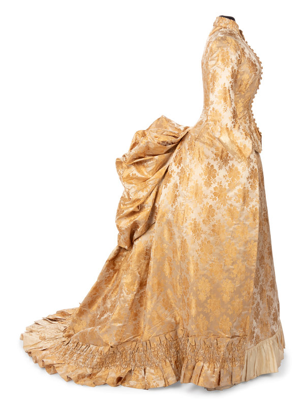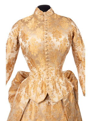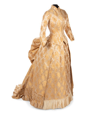 Golden yellow and ivory silk satin woven with a floral pattern in a bustled two-piece dress with fitted bodice with attached side and back bustle/polonaise trimmed in pleated self fabric, three quarter sleeves, and front button closures; paired with matching underskirt trimmed with satin pleats and crinoline dust ruffle, and backed in cotton panel with hook and eye closure.