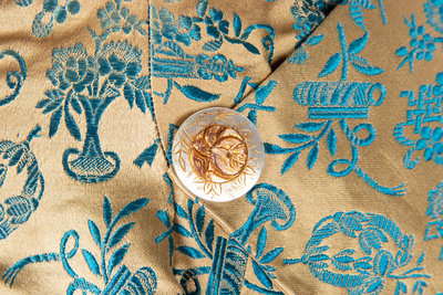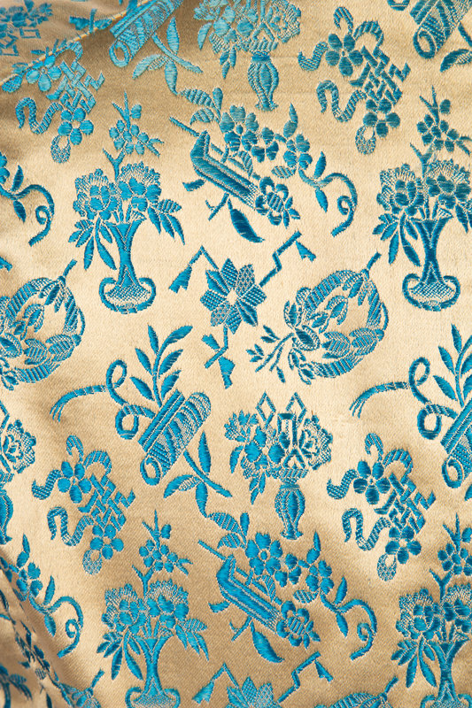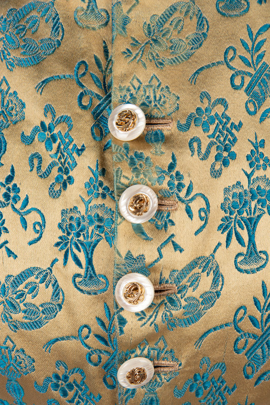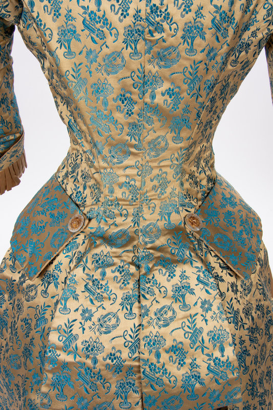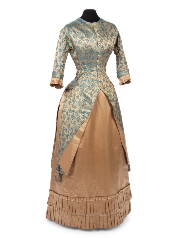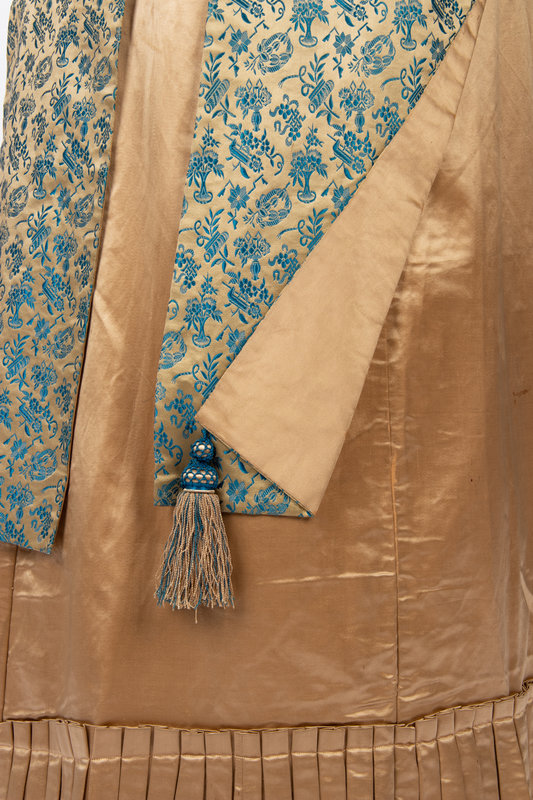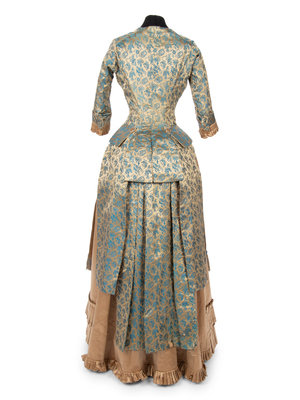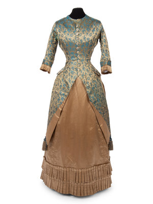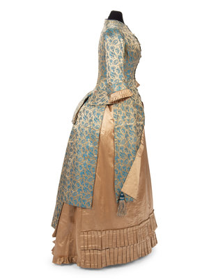 Wheat silk satin woven with vase, floral and ribbon pattern in a two-piece bustled dress with fitted bodice, three-quarter sleeved trimmed with pleated satin and bows, attached panel overskirt with hip flaps and back bustle, and detailed with silk thread tassels, shell and gold-tone paint buttons, and center front button closures; paired with matching wheat silk satin underskirt hemmed with pleated satin.