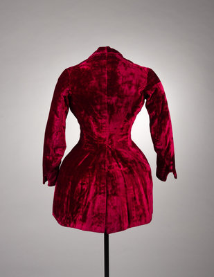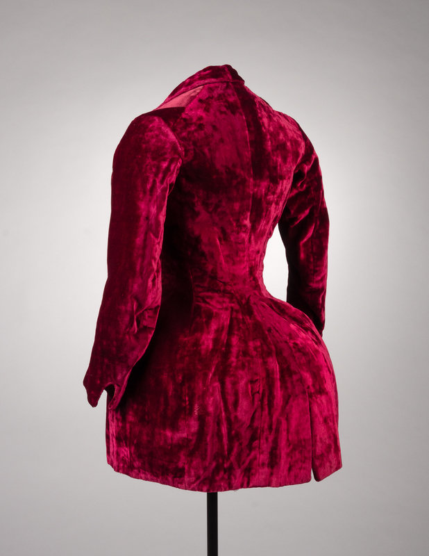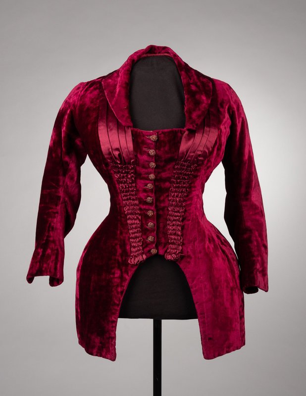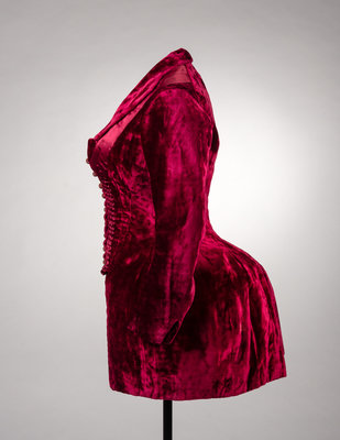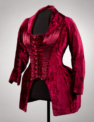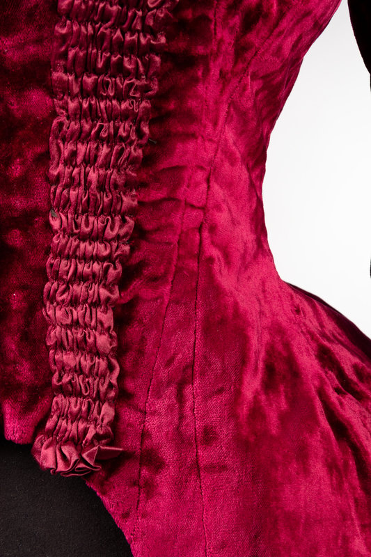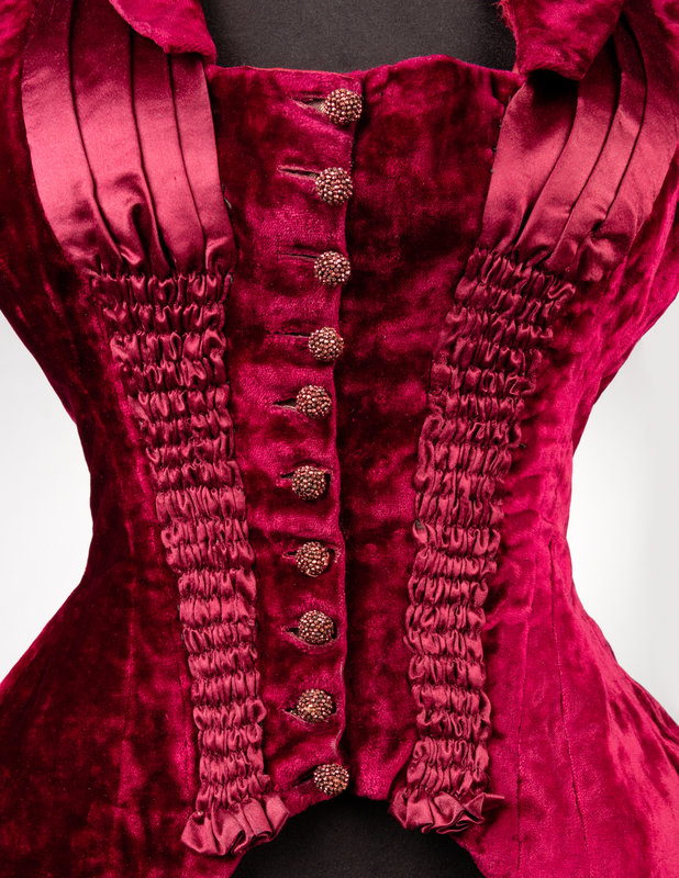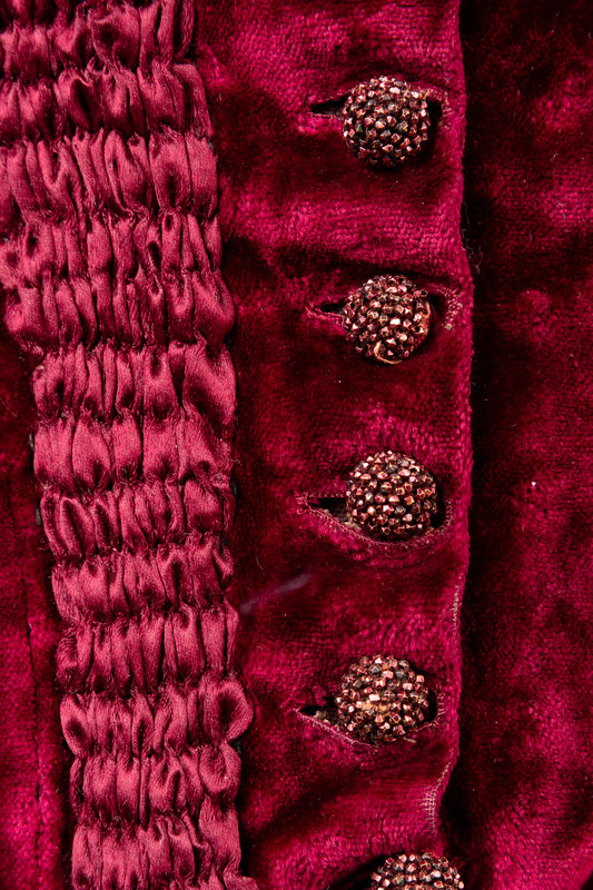 Burgundy silk velvet bodice with smocked and pleated silk satin front panels, rolled collar, long sleeves, and front seed bead embellished button closures.