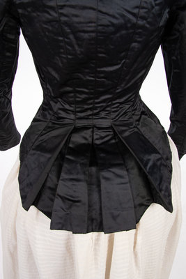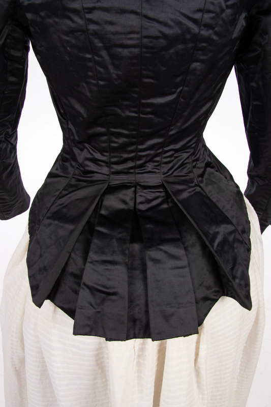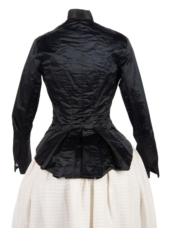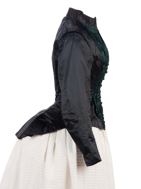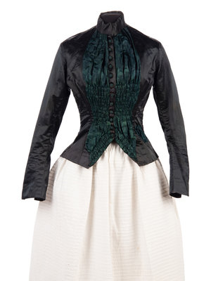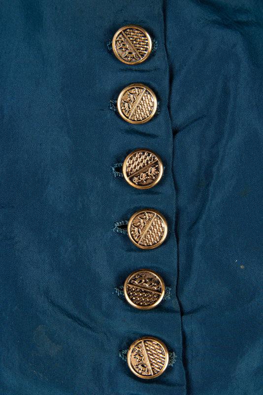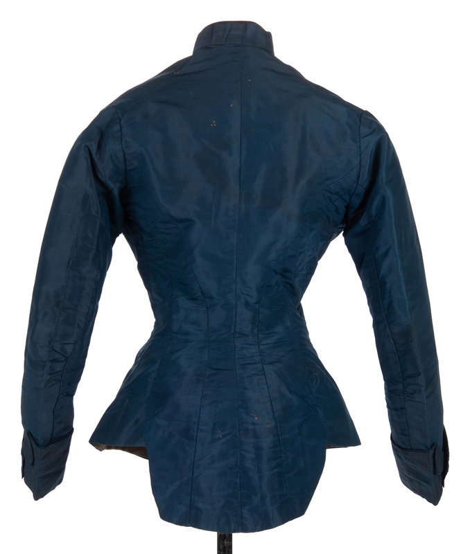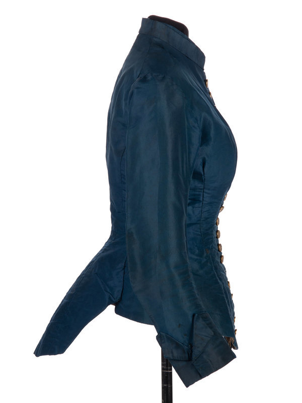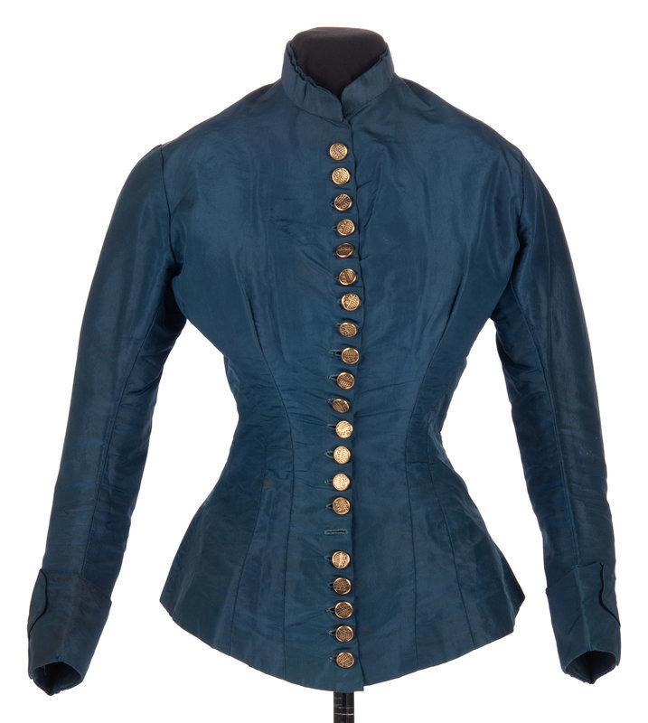Blue silk/wool blend taffeta bodice with rounded band collar, cuffed long sleeves, and brass-tone front button closures.
