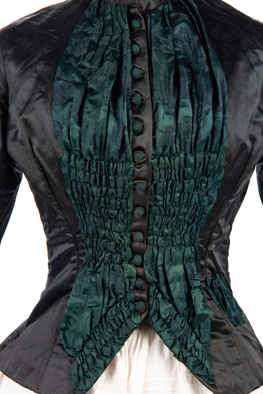 Dark teal silk satin bodice with smocked and gathered teal silk patterned satin, band collar, long plain sleeves, and center front covered button closures.