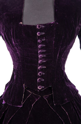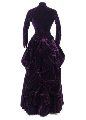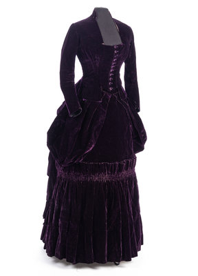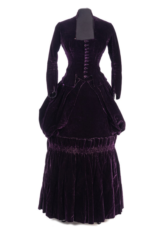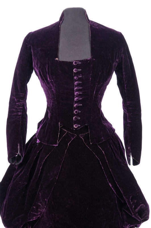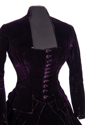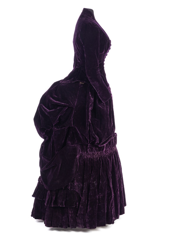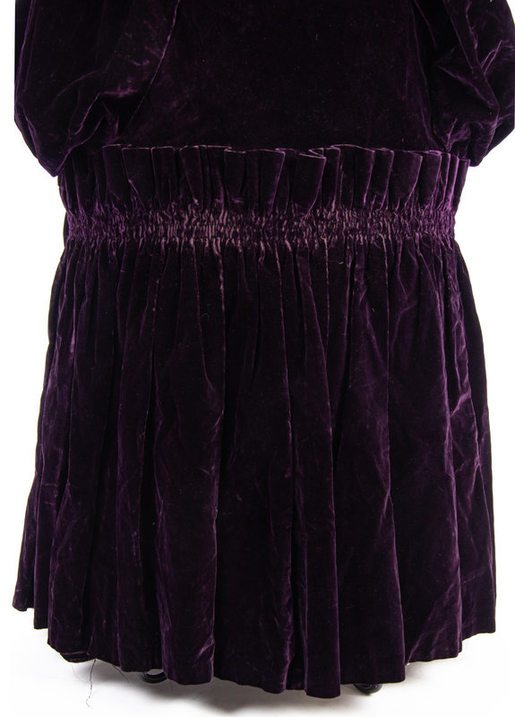 Dark purple silk velvet evening dress with box neckline, fitted sleeves and center front button closures; paired with matching dark purple silk velvet skirt with hip draped bustle and shirred pleat detail.