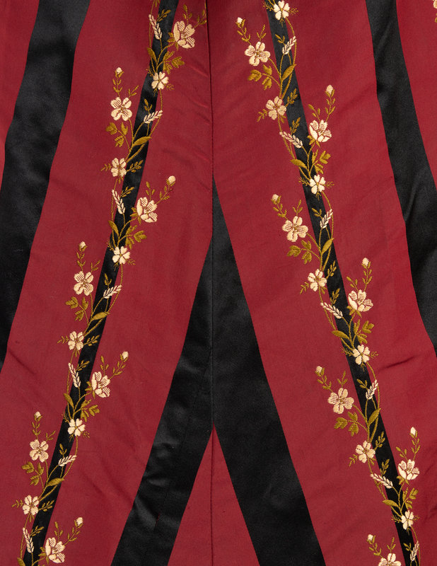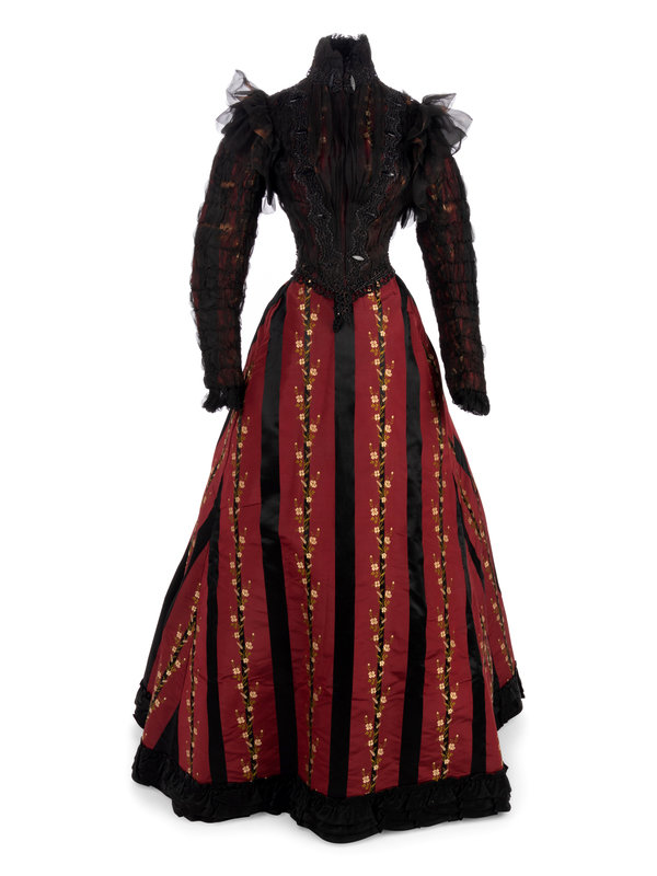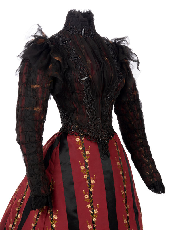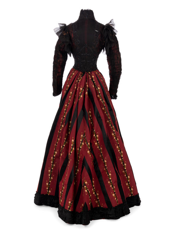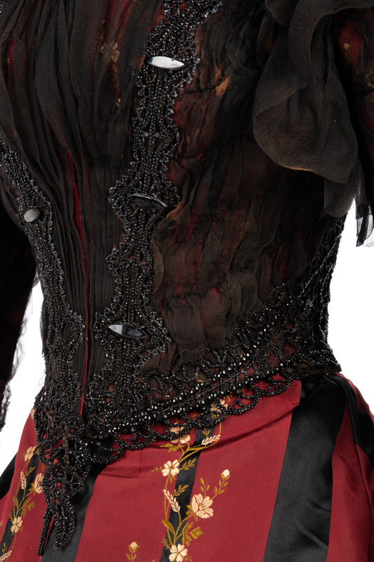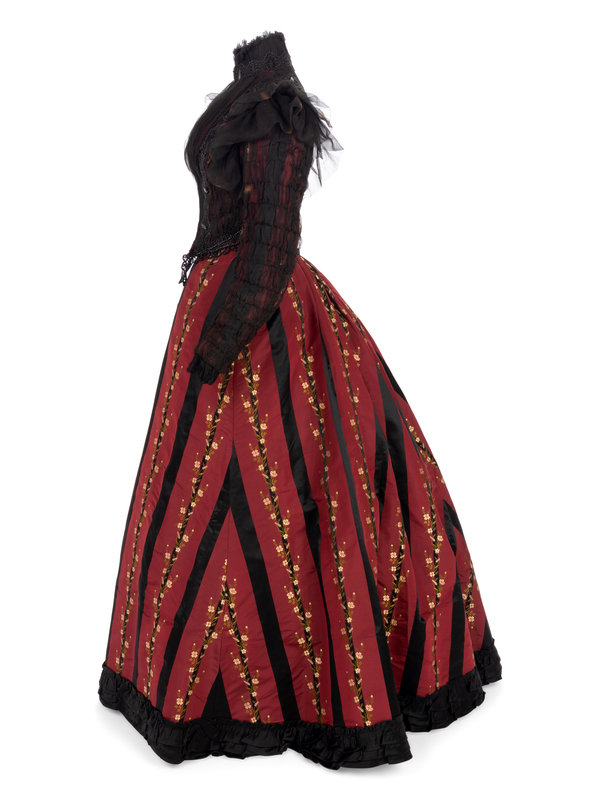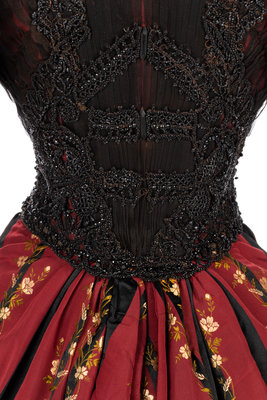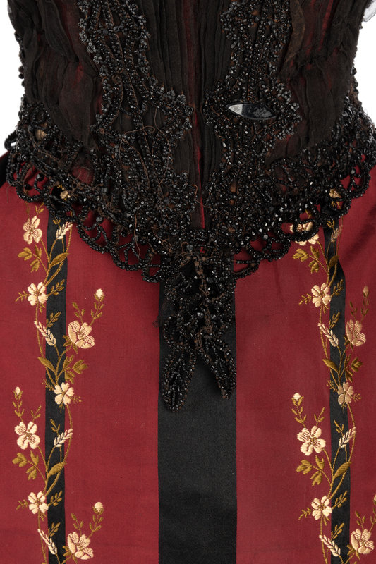 Red and black silk striped evening dress woven with a floral pattern with a bodice covered with shirred chiffon embellished with black jet beads, stand collar, fitted sleeves, and front hook and eye closures; paired with matching silk taffeta brocade skirt trimmed with rows of ruffled black taffeta and red taffeta pleated dust ruffle.