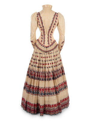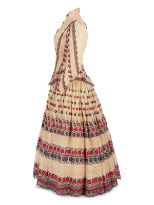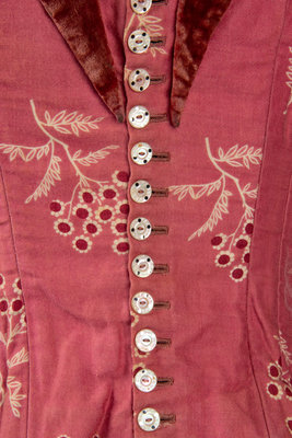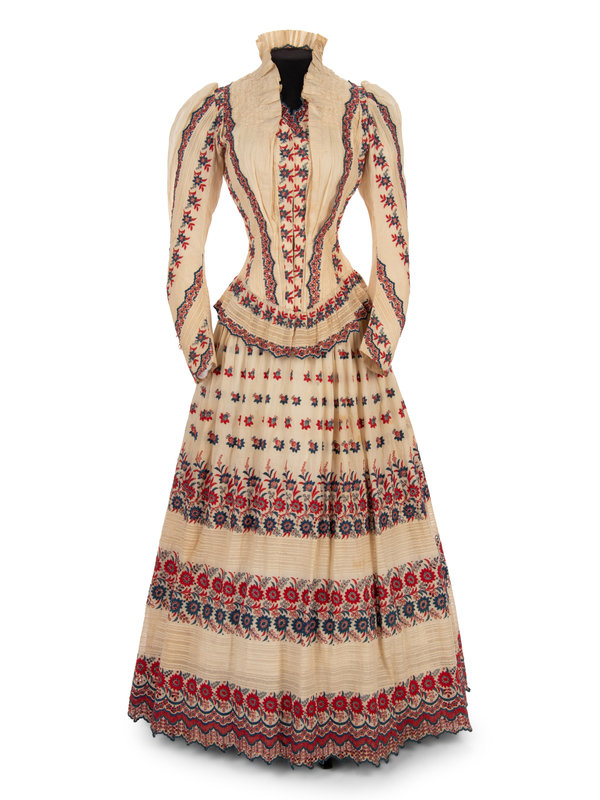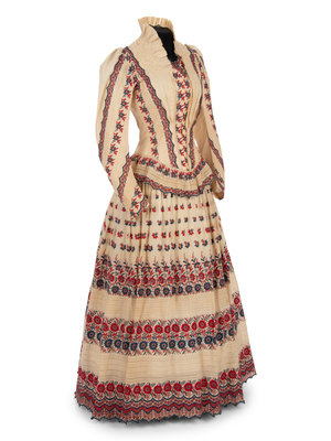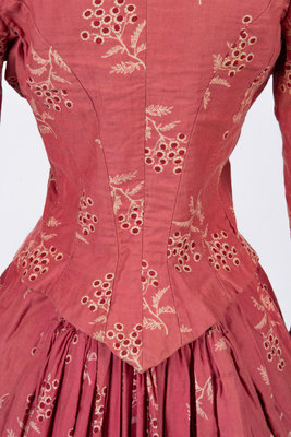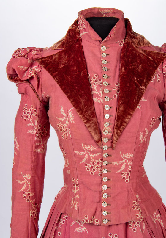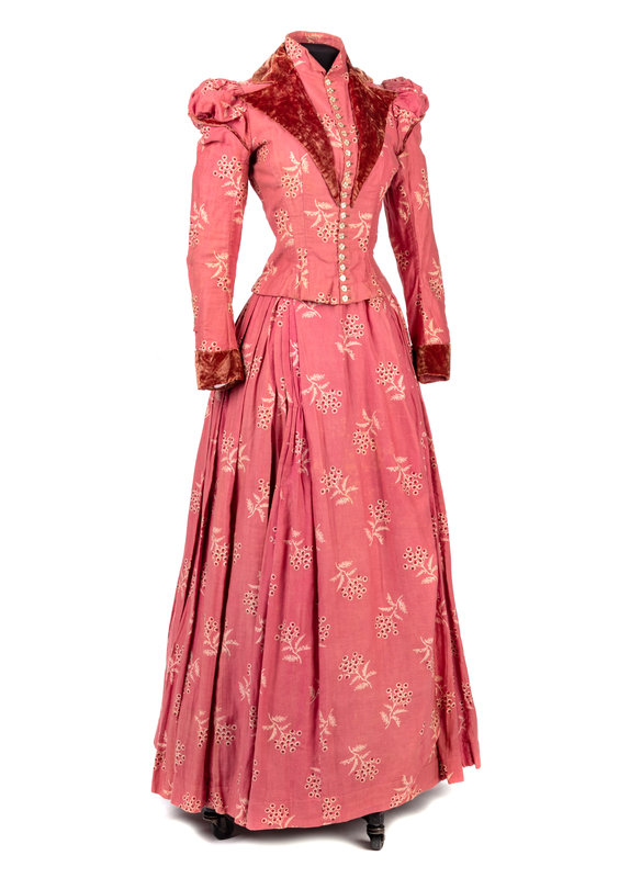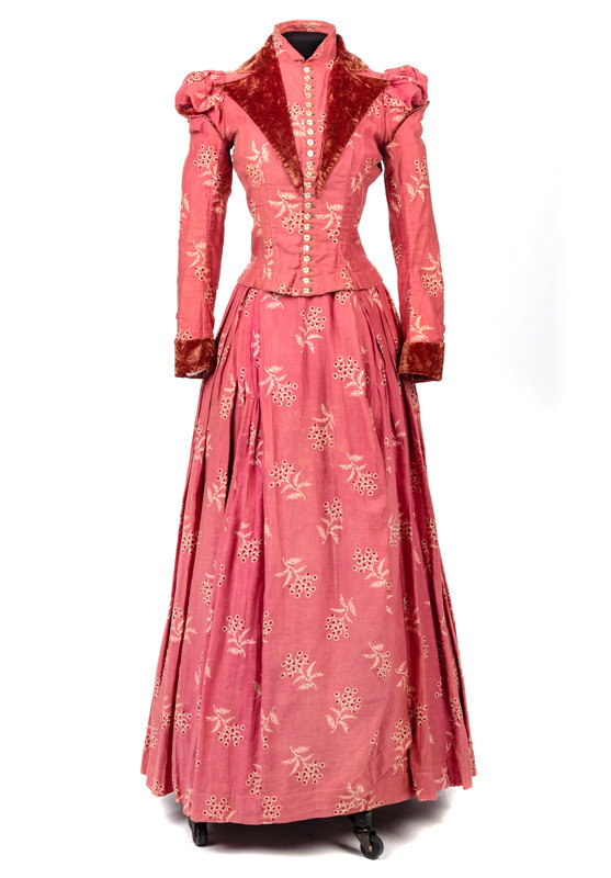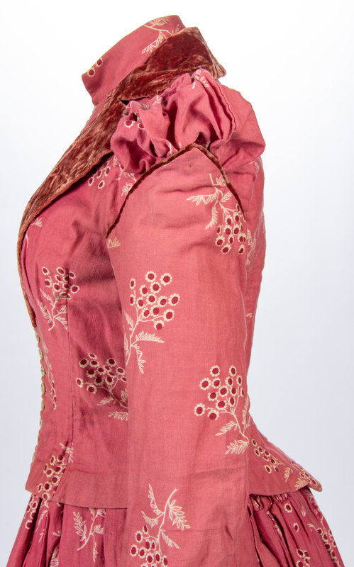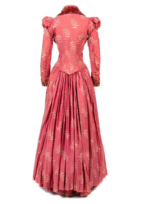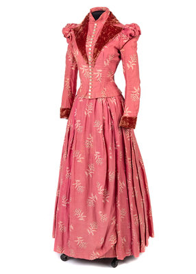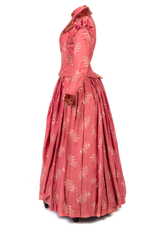 Pink cotton two-piece day dress printed with white and red floral motif, trimmed in pink silk velvet on collar and sleeves, and front shell buttons inset with metal discs; paired with matching pink cotton printed bustle skirt with pleated waistline.
