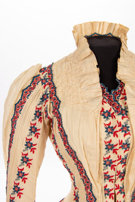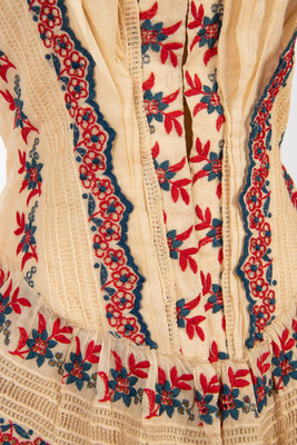 White cotton with blue and red machine embroidered flowers in a day dress with ruffled and smocked neckline, long sleeves, gathered high hip line, and center front hook and eye closures; paired with gathered full skirt with adjustable pink elastic drawstring waistline (not original).