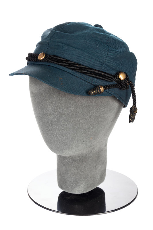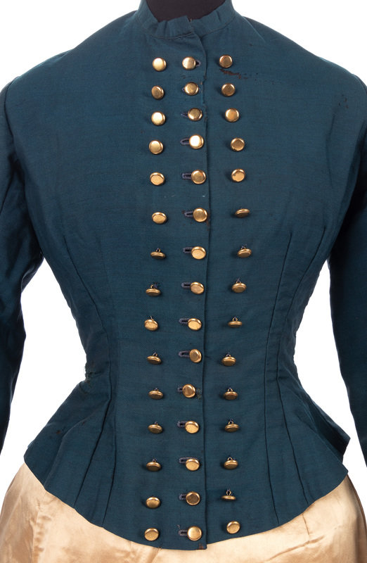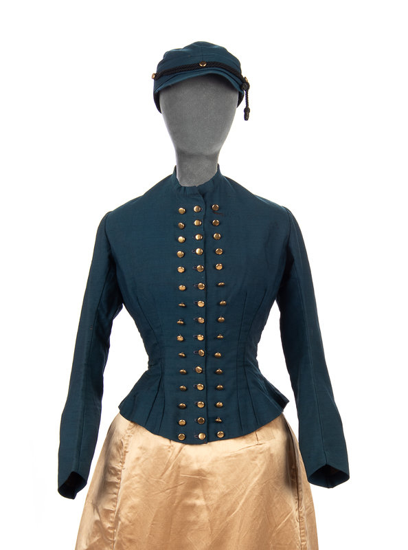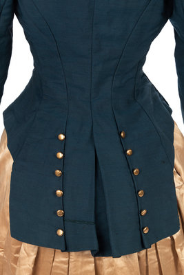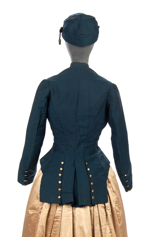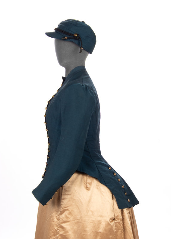 Blue wool riding bodice with banded collar, long sleeves, rear coat tails to be worn over a bustle, and three rows of center front brass button closure; paired with matching blue wool riding hat with black braid and brass button detail.