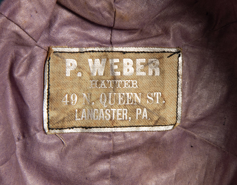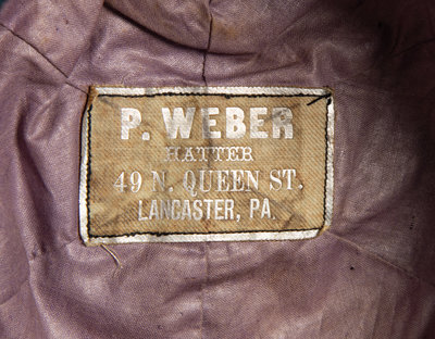 Label (hat): P. Weber / Hatter / 49 N. Queen St. / Lancaster, PA.