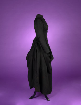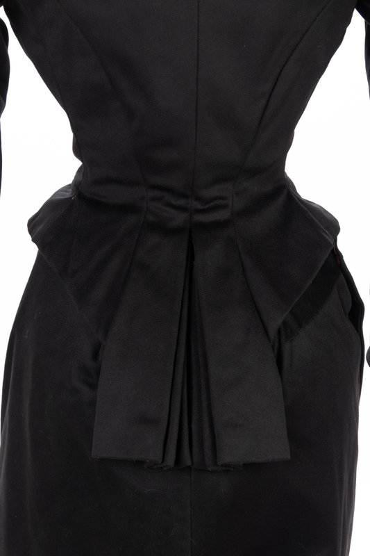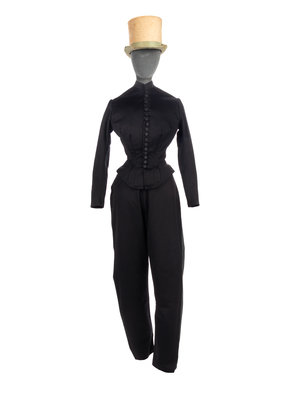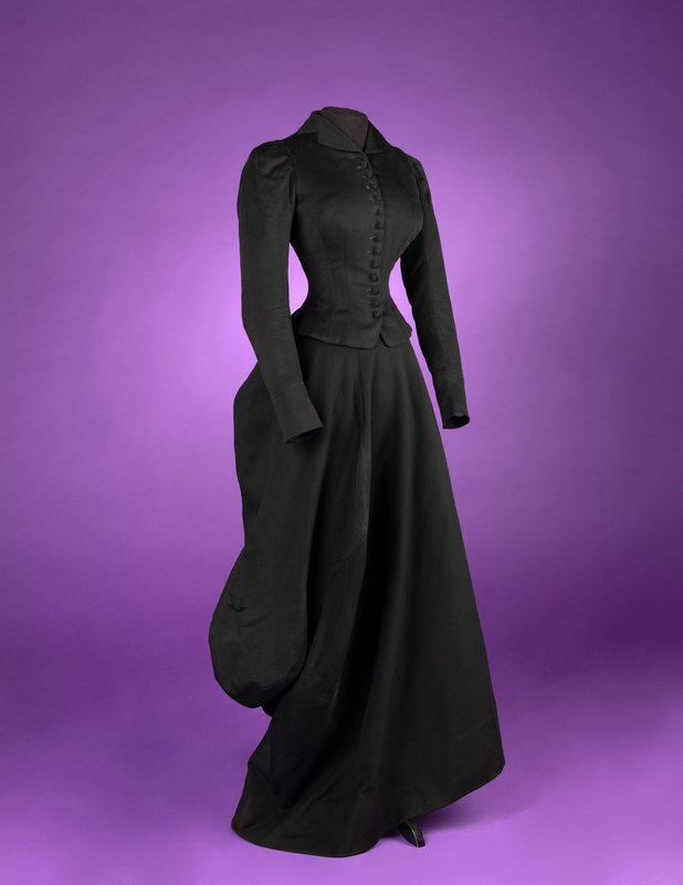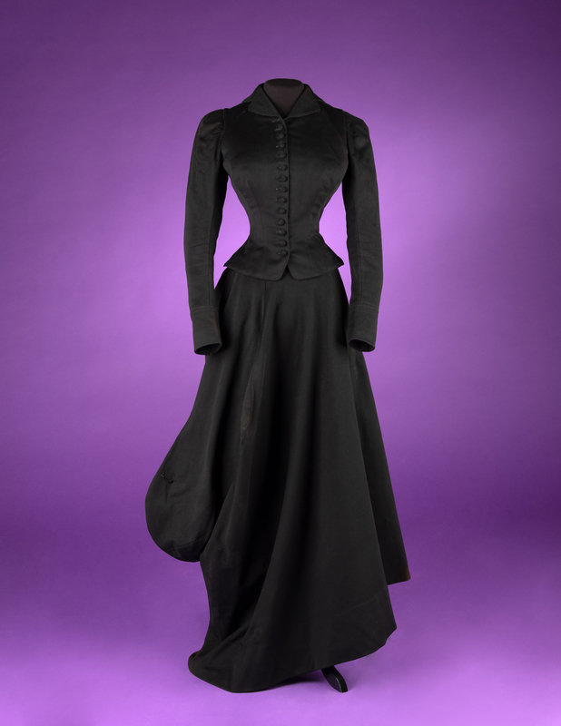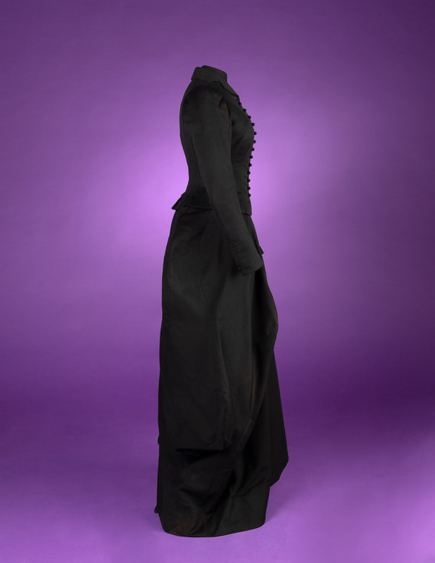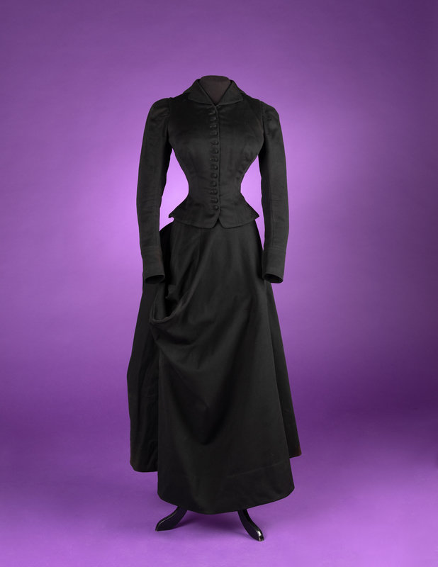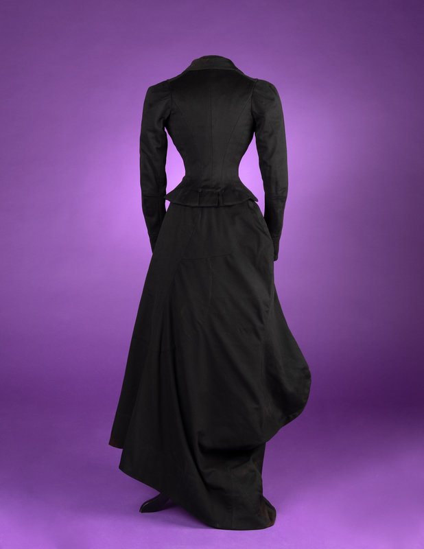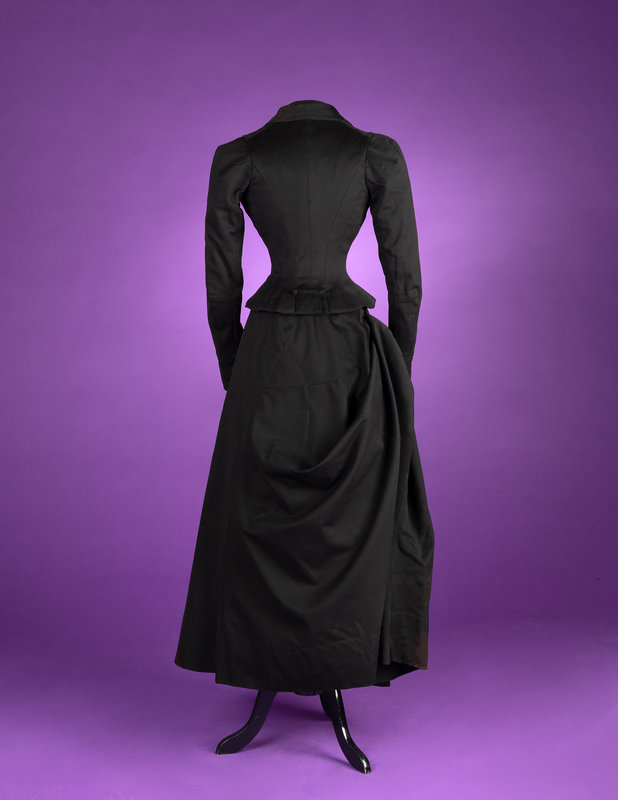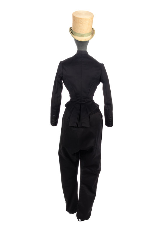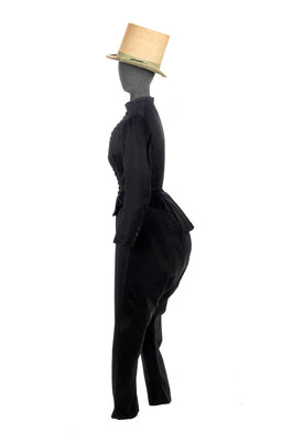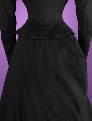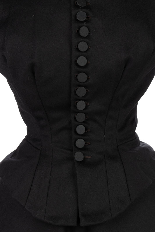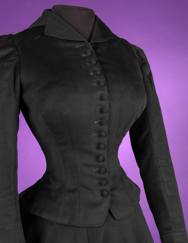 Black wool riding bodice lined with tan glazed polished cotton, banded collar, long sleeves, internal Petersham belt, and black satin covered button closures.