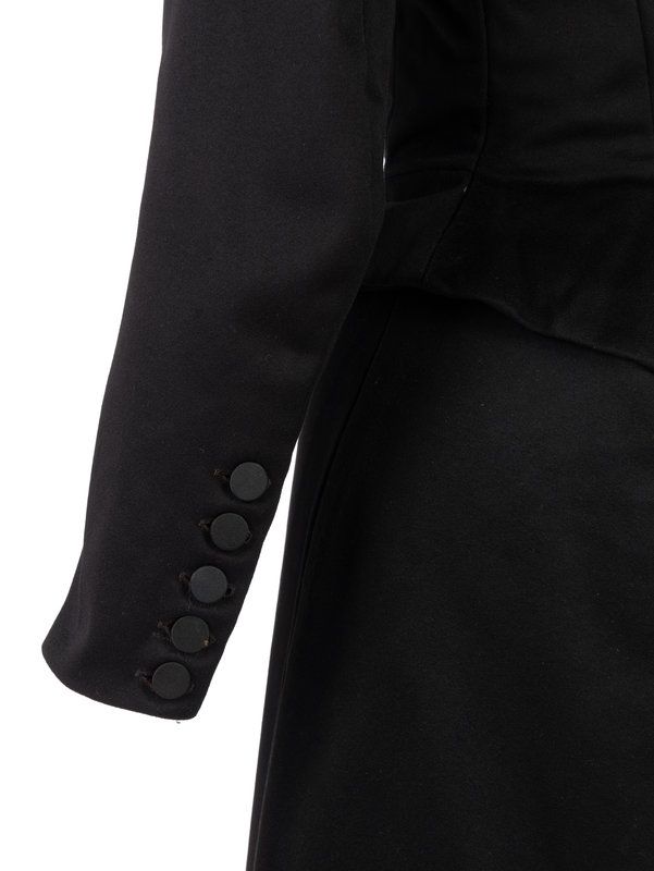 Black wool riding bodice lined in black satin with high single notch collar, long sleeves, internal Petersham belt, and buttoned front closures