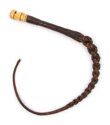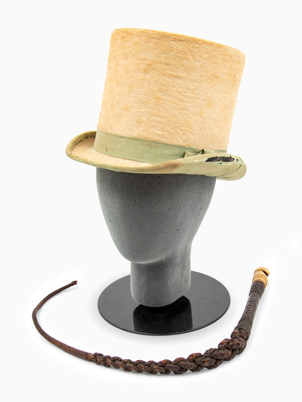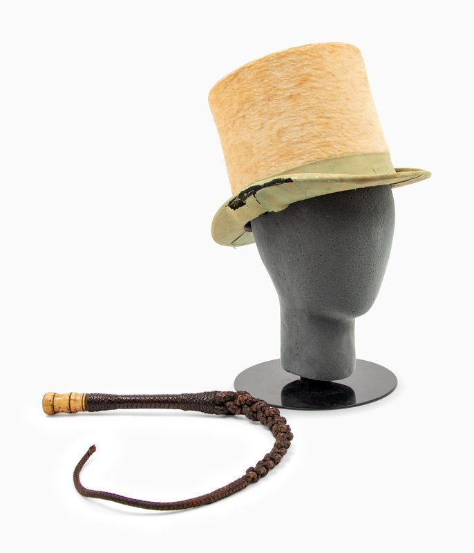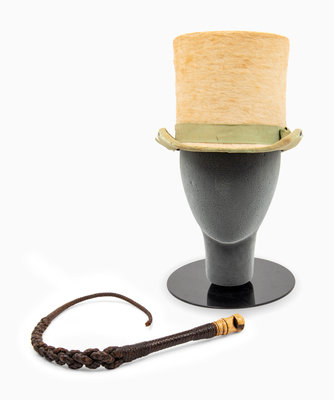 Women's Riding Top Hat and Braided Leather Whip, 1880s