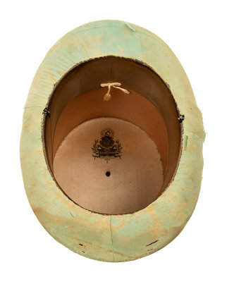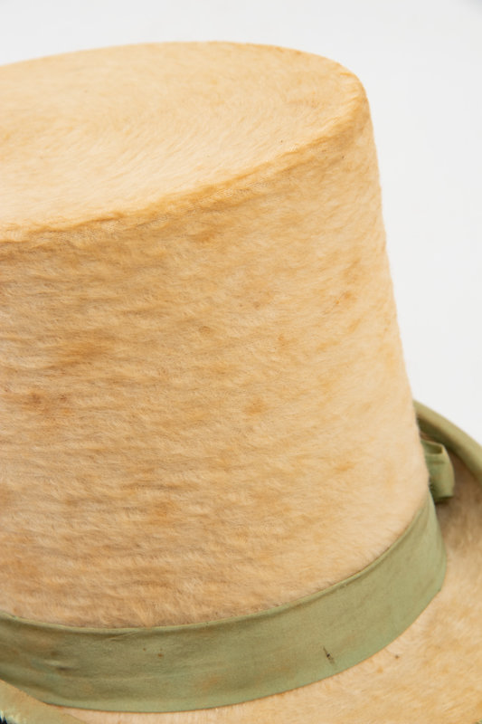 Cream silk plush hat with pale green taffeta faced brim and band with bow.