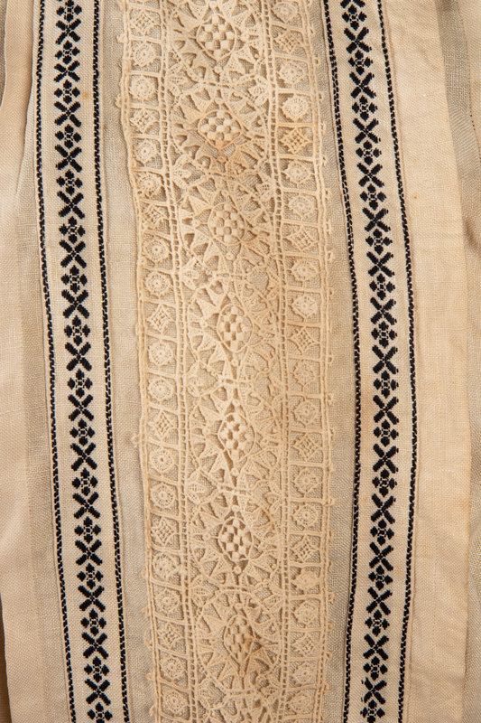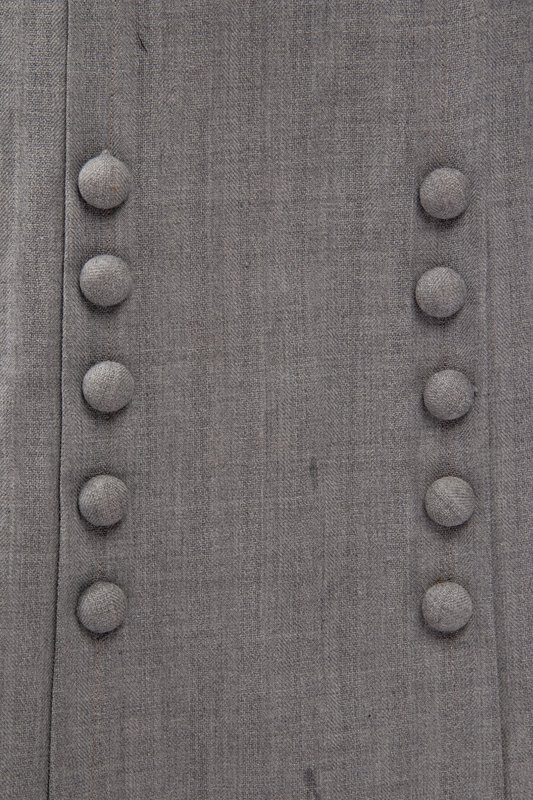 Light blue wool modified twill walking suit with single notch lapel, three rows of buttons closures; paired with matching paneled skirt and a natural linen button up blouse with lace trim.