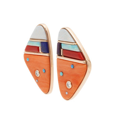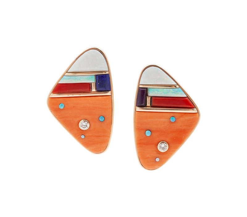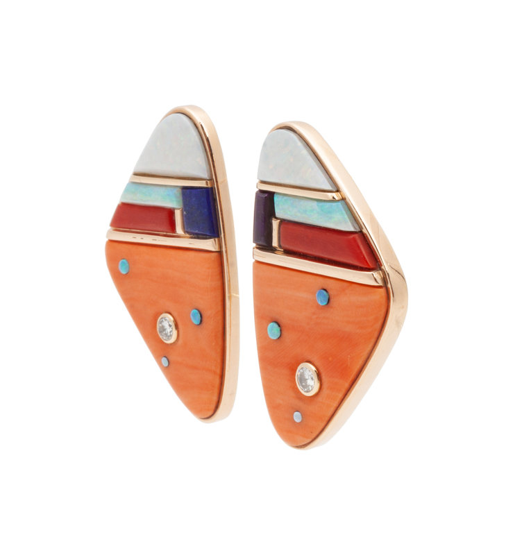 Gold Earrings, set with Opal, Coral, Lapis, and Diamonds