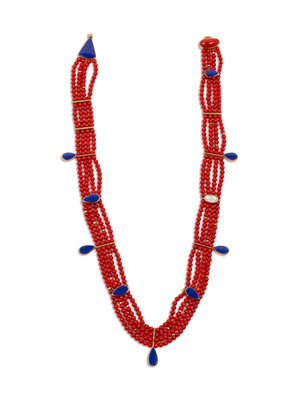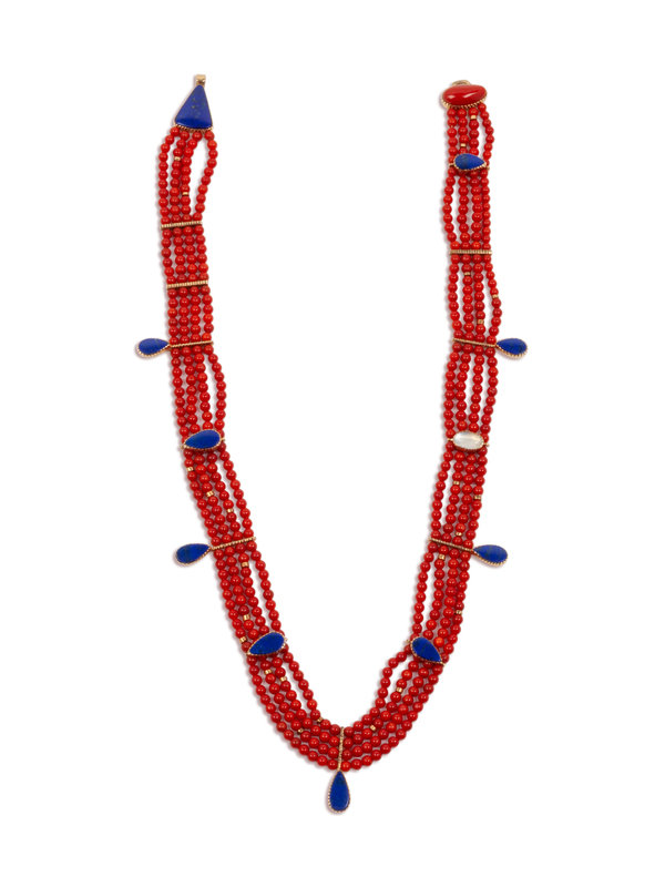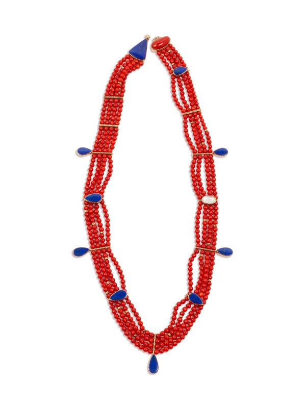 Multi-Strand Coral, Lapis, and 14k Gold Necklace
