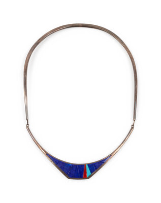 Silver Choker with Lapis, Coral, and Turquoise Mosaic Inlay