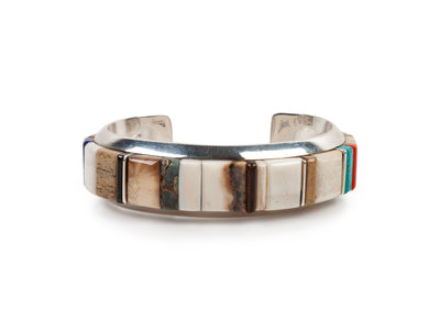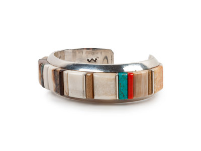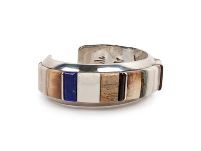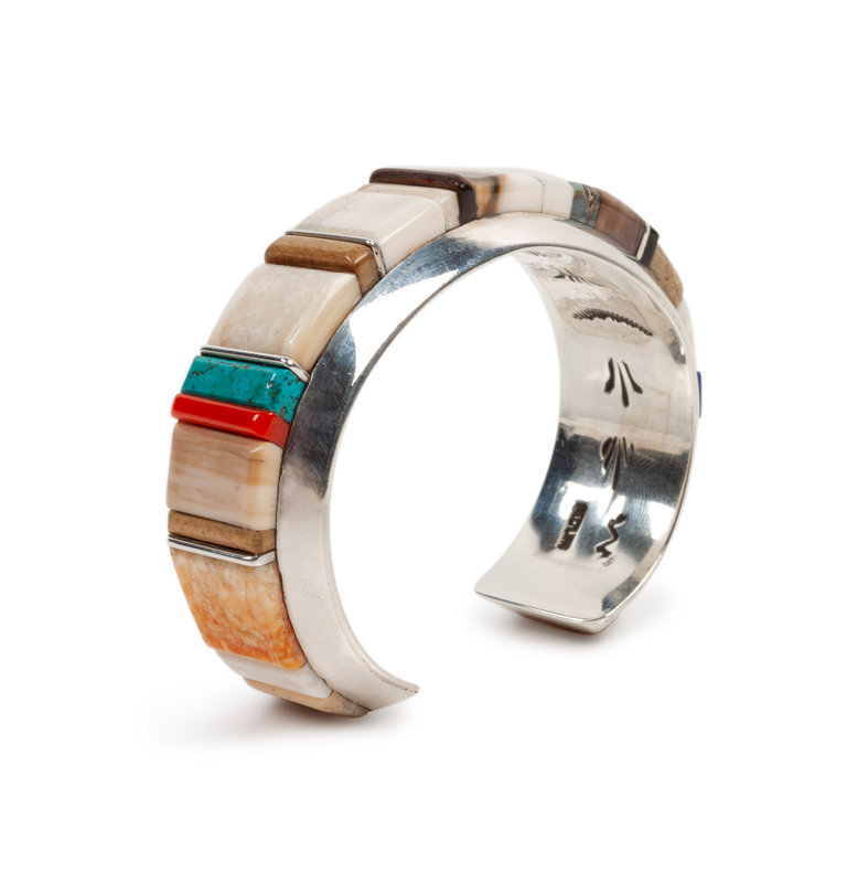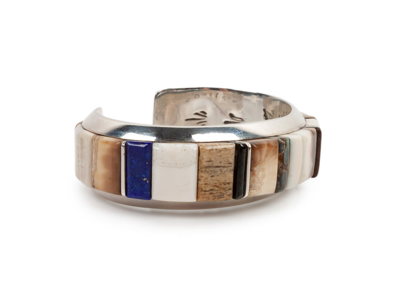 Silver Cuff Bracelet with Turquoise, Coral, and Lapis Cobblestone Inlay
