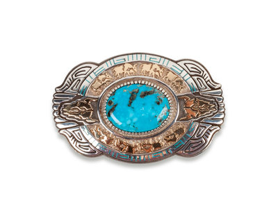 Sterling Silver Belt Buckle, with Morenci Turqoise and 14k Gold Accents