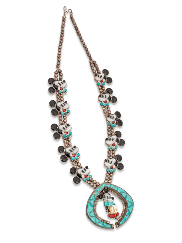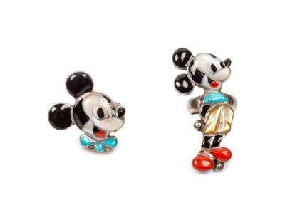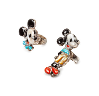 Zuni-Toon Mickey Mouse Squash Blossom Necklace, and Two Rings, 1974 and 1975