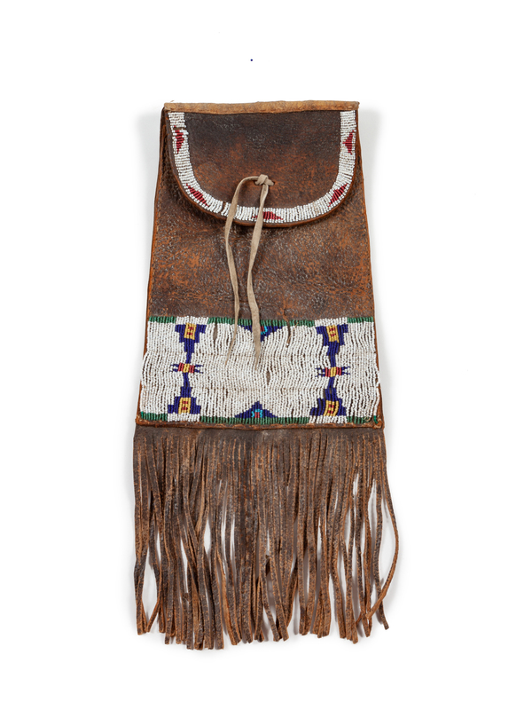sinew-sewn on harness leather and beaded using colors of red white-heart, white, dark blue, and translucent green