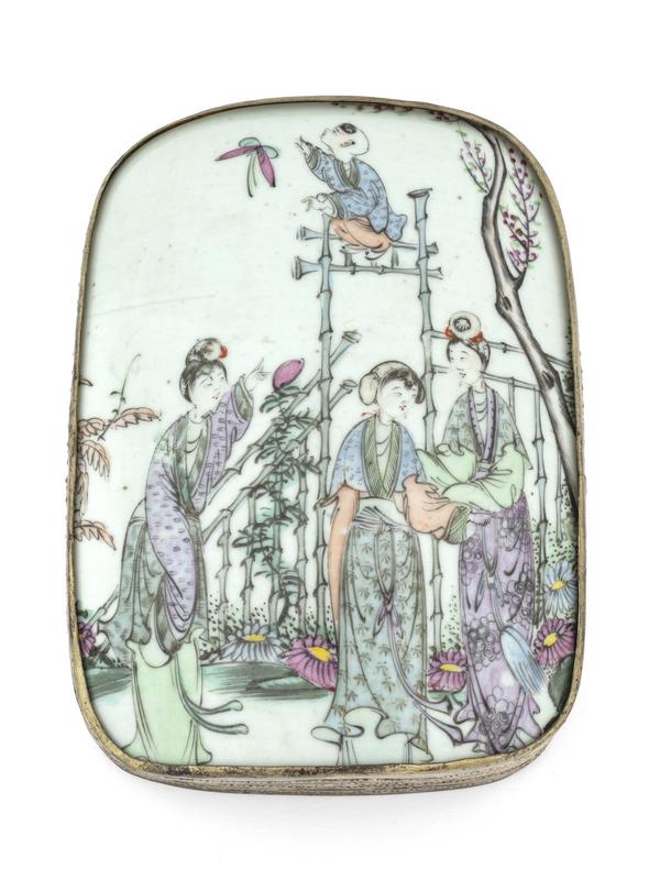 A Chinese Export Painted Porcelain Fragment Mounted in Silvered Metal Box Lid