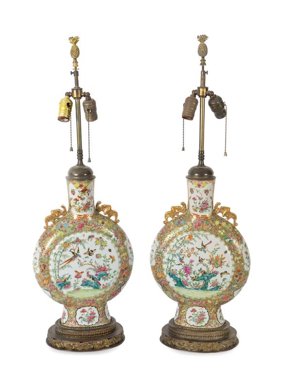 A Pair of Bronze-Mounted Chinese Famille Rose Porcelain Pilgrim Flask Vases Mounted as Lamps