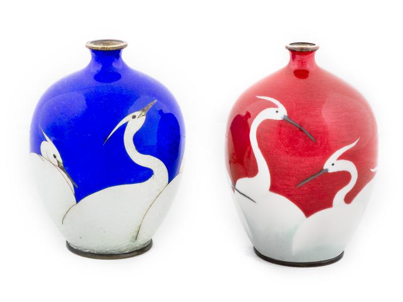 one with white herons on a red foil ground, the other on a blue ground; each stamped on base.